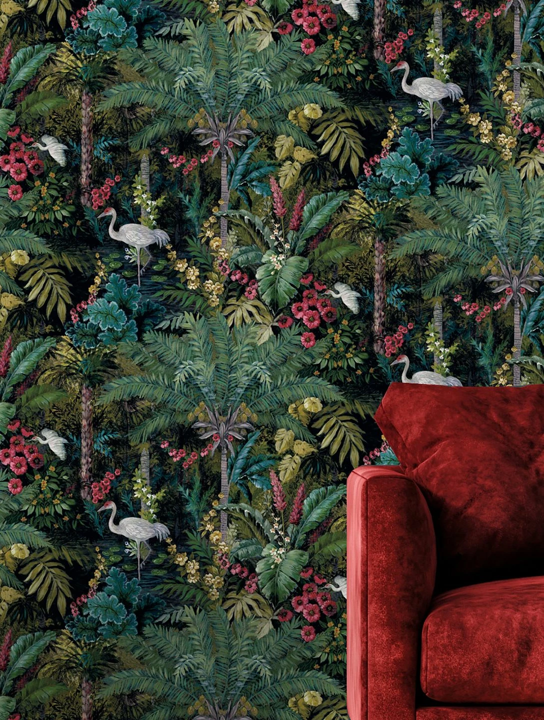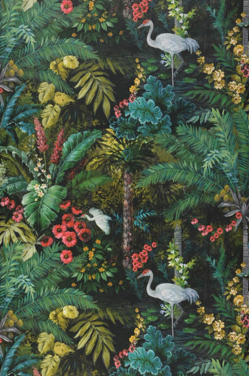 Geheimnisvoll und voller Leben ist der tropische Dschungel, der auf Vliestapete Melora abgebildet ist. Auf dem dunklen Grund entsteht zwischen den opulenten Blattpflanzen in tiefen Blau- und Grüntönen interessante räumliche Tiefe. Dazwischen leuchten die Blüten in hellen Rot- und Gelbtönen und die großen weißen Kraniche hervor. Besonders raffiniert: Das Design spielt geschickt mit Vorder- und Hintergrund, so dass eine fast magische Welt entsteht.
