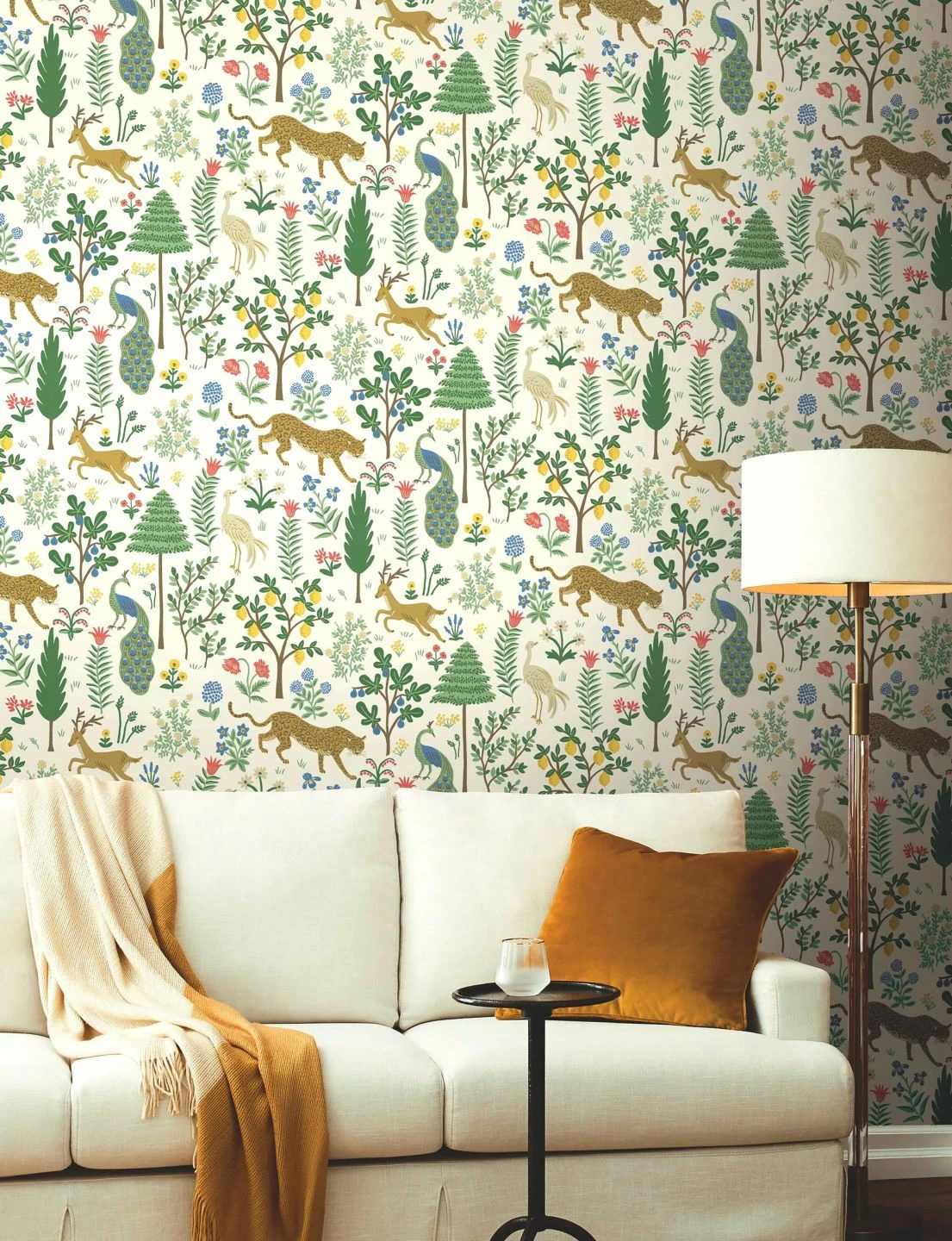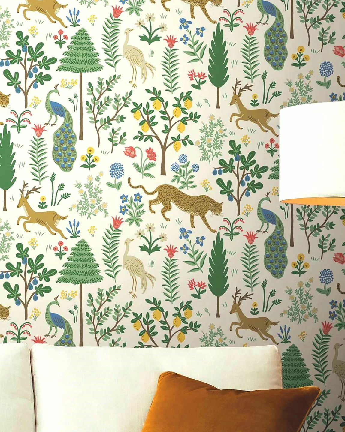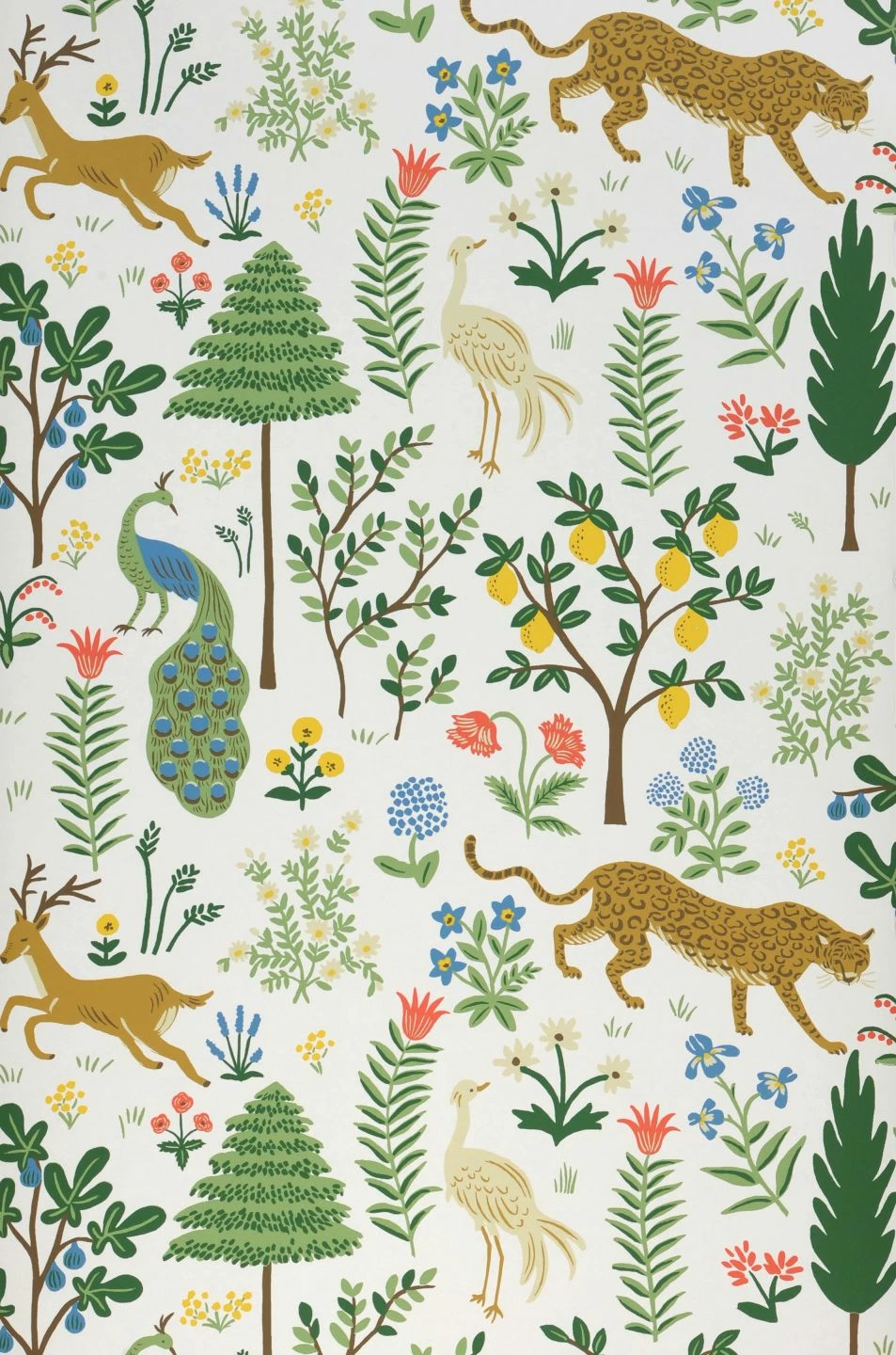 In einer friedlichen Welt voll von bunten Blumen und Bäumen mit reifen Früchten leben Pfauen, Hirsche und Kraniche Seite an Seite mit Leoparden. Das charmante Design von Rifle Paper erzählt von einem paradiesischen Garten, in dessen Flora und Fauna es viel zu entdecken gibt, und zaubert Ihnen eine heile Welt in Ihr Zuhause. Der helle Untergrund und die freundlichen Farben machen Vliestapete Menagerie dabei verblüffend vielseitig.