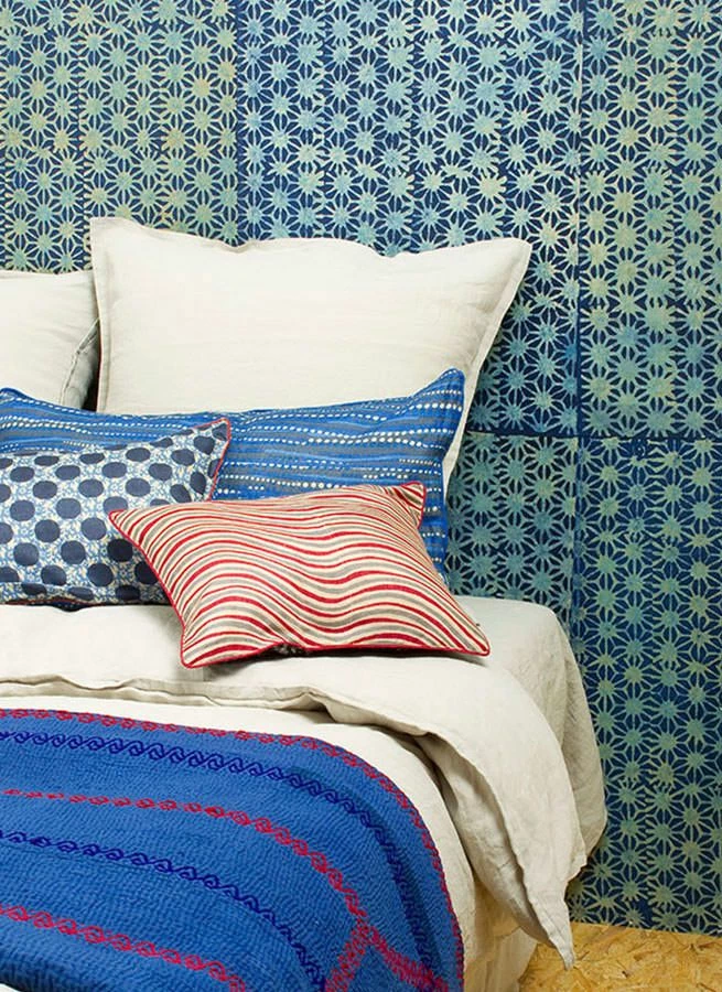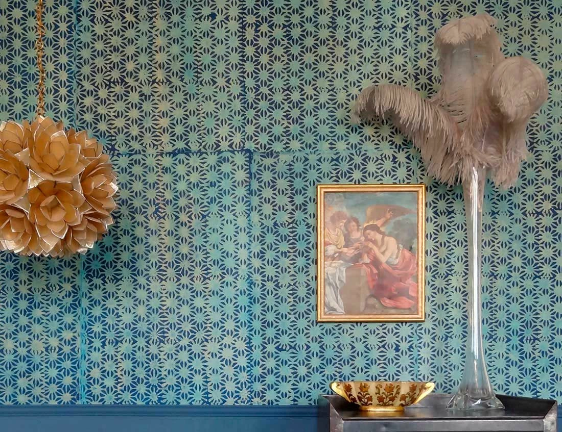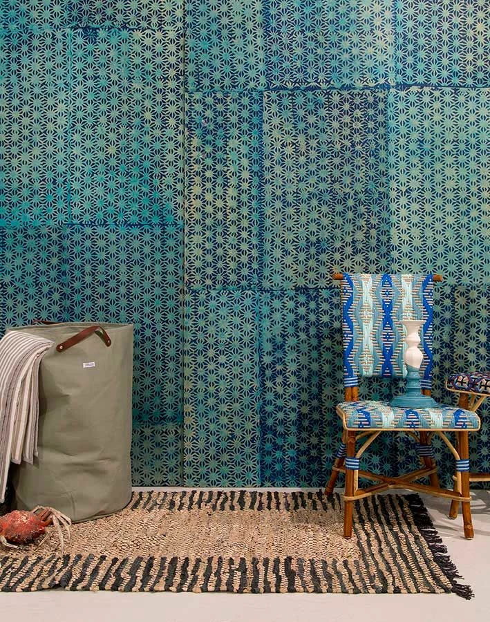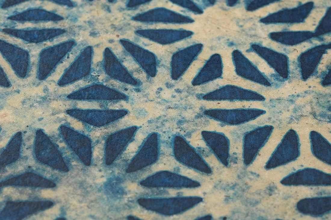Die hohe Kunst der Batikfärberei kommt auf dieser Unikat Tapete des französischen Designerlabels Le Monde Sauvage wunderschön zur Geltung. Stilisierte Blüten bilden an der Wand ein schwungvolles Mexikomuster, das sich für Ethno-Styles mit blauer Note hervorragend anbietet. Jedes Blatt ein Unikat und von Hand bedruckt. Die Anordnung ist Ihrer kreativen Ader überlassen.