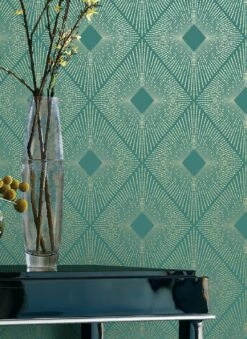 Das funkelnde Rautenmuster im unverwechselbaren Stil des Art Deco entsteht hier aus einer Vielzahl feiner glitzernder Linien aus Tupfern von Gold, die sich wie ein Feuerwerk nach außen hin ausdehnen. Der dreidimensionale Effekt ruft die Illusion von räumlicher Tiefe und Bewegtheit gleichermaßen hervor. Auf dem minttürkisen Untergrund wirken die goldfarbenen Ornamente luxuriös und gleichzeitig schwerelos.