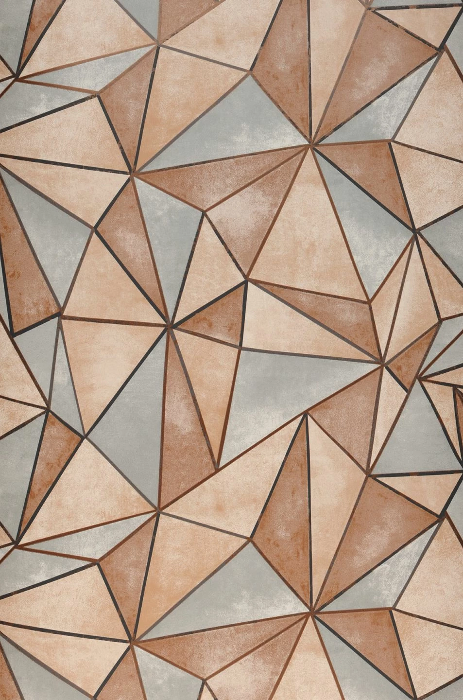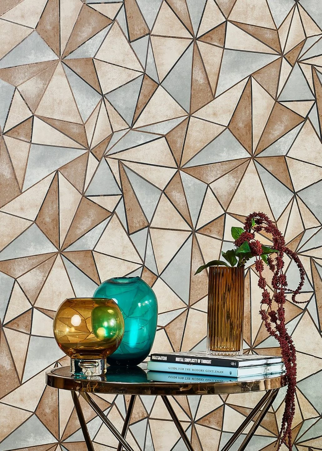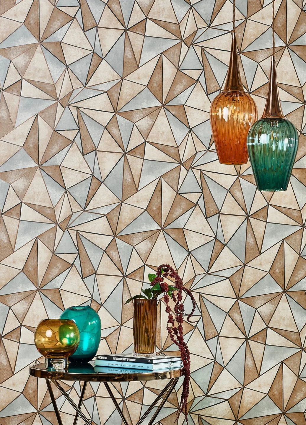 Das außergewöhnliche Design dieser Tapete lässt unweigerlich an gefärbtes Glas – im bekannten Tiffany-Stil oder von modernen Kirchenfenstern – denken. Dreieckige Elemente wie in einem Kaleidoskop von Grau-, Braun- und Beigetönen füllen die Fläche voll aus. Voneinander abgesetzt werden sie durch dunklere Linien ähnlich wie in der Tiffany-Glaskunst. Kombiniert mit den passenden Farben, belebt die Tapete Ihre Wand auf unvergleichliche Weise.