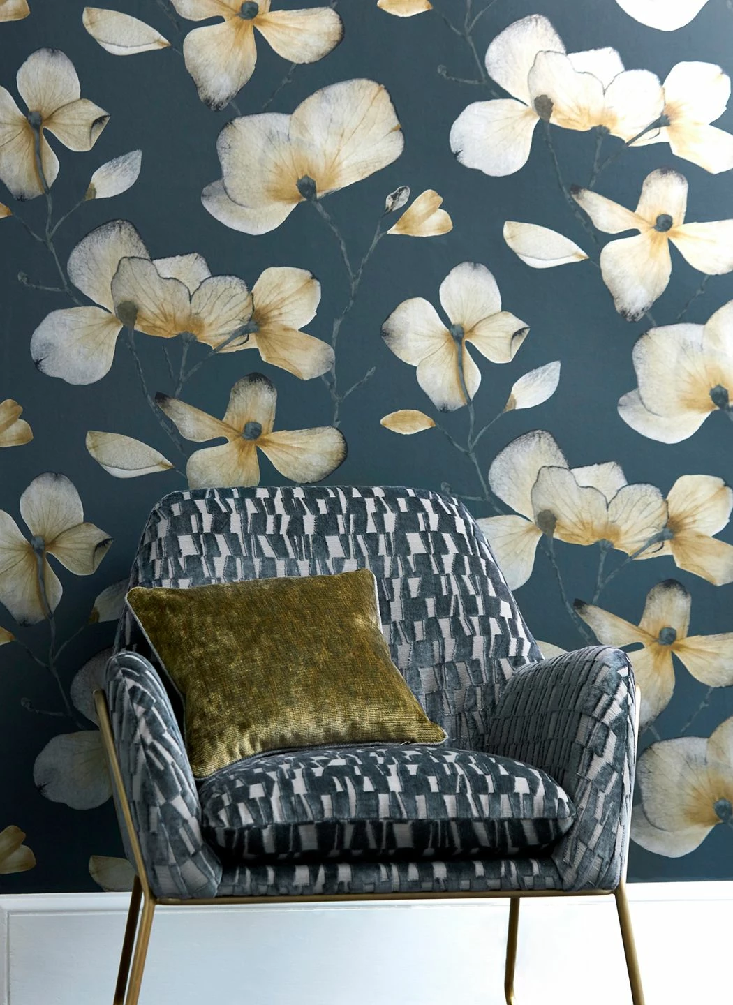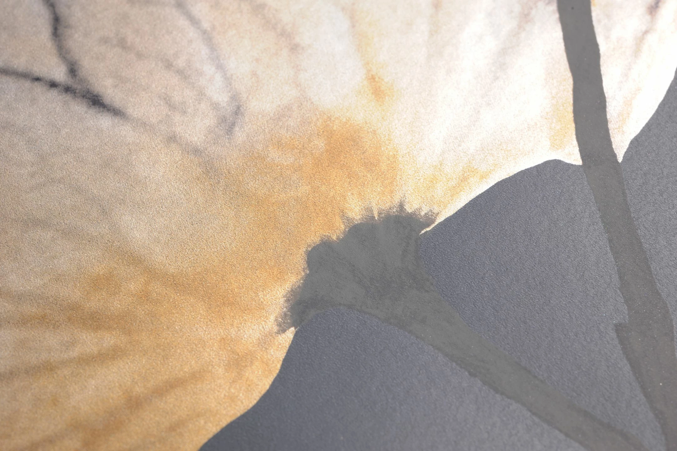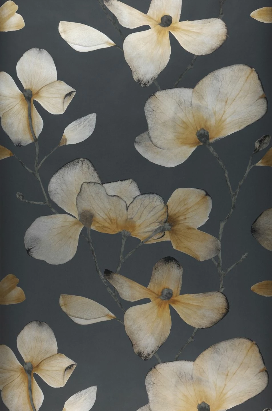 Prachtvolle große Blüten in schimmerndem Perlbeige und Olivbraun scheinen schwerelos an ihren Zweigen zu schweben. Der anthrazitgraue Hintergrund lässt ihre hellen Farben besonders leuchten, so wie am Abend die Farben von Blumen noch einmal eine besondere Strahlkraft entwickeln. Die Vliestapete macht Ihr Wohnzimmer oder Ihr Schlafzimmer zu einer romantischen und gleichzeitig eleganten Oase der Ruhe.