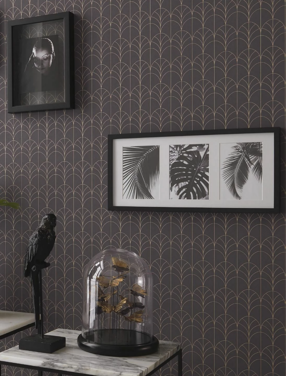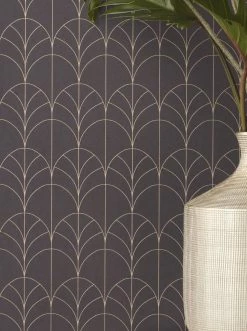 In dunklen Farben gestaltete Räume vermitteln behagliche Eleganz und zeigen mitunter auch sehr exotische Nuancen. Glamouröse Exotik ist das Stichwort für diese Designtapete im Art Deco Stil, die sich nach Lust und Laune frei entfalten kann. Schokoladiges Schiefergrau setzt das schimmernde Gelbgold des Musters perfekt in Szene.