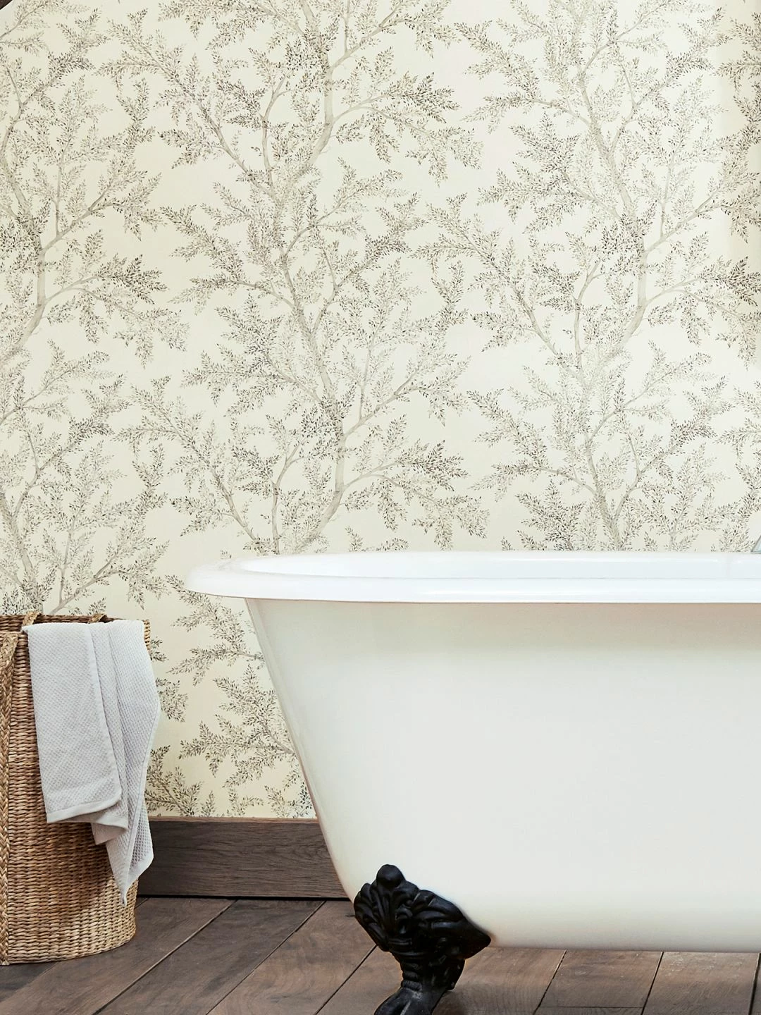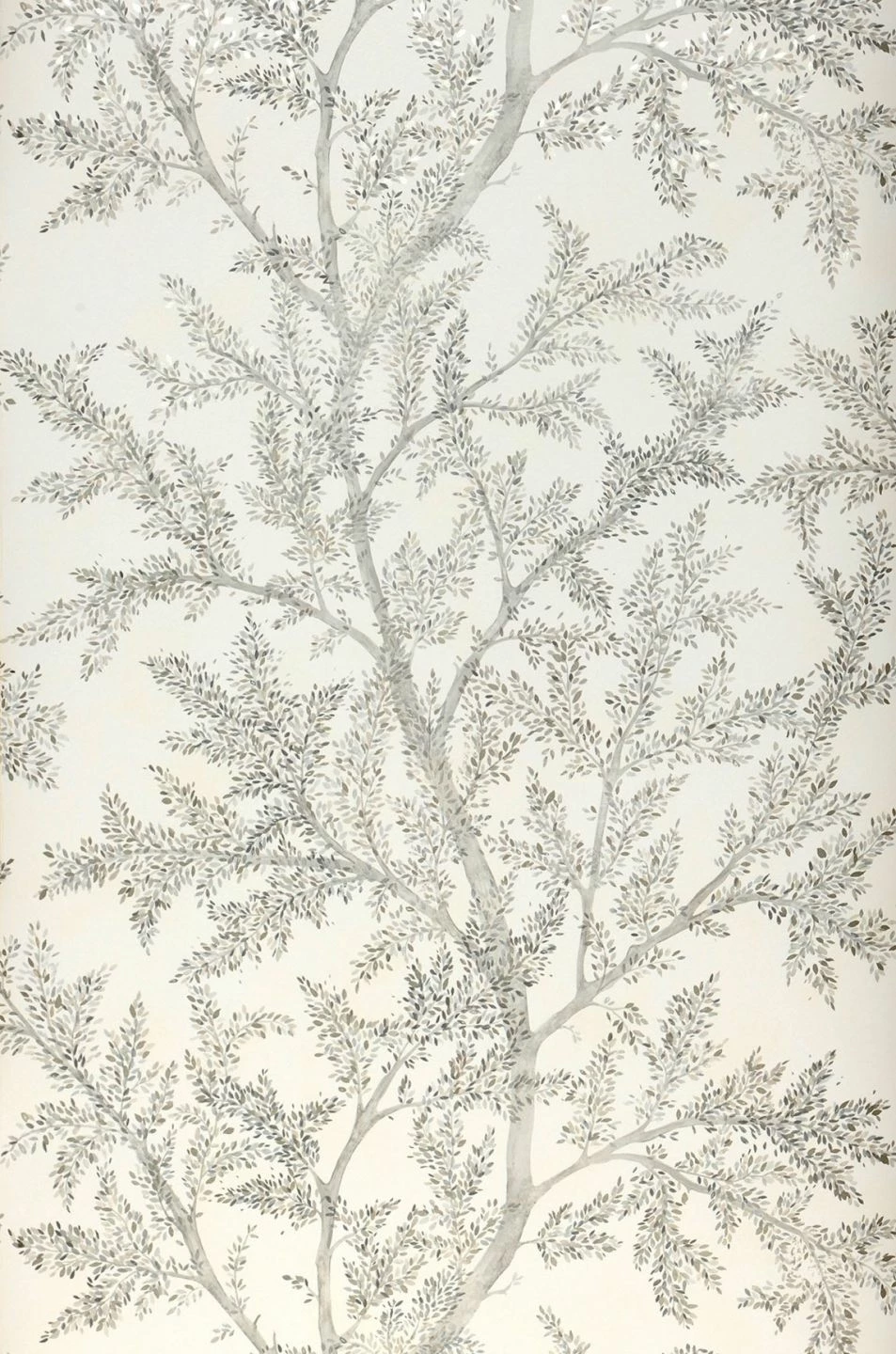 An zarten, wie mit Aquarellfarbe gemalten Ästen und Zweigen sitzen kleine, zierliche Blätter, die mit feinen Pinseltupfern angedeutet sind. Helle Grautöne und schimmerndes Silber auf dem cremeweißen Grund tragen zu der luftigen, leichten Wirkung dieser Vliestapete bei und erzeugen wie glänzendes Laub leichte Lichtreflexe. Mit hellen, grauen oder Holzmöbeln entfaltet die Tapete ihre ganze Eleganz.