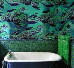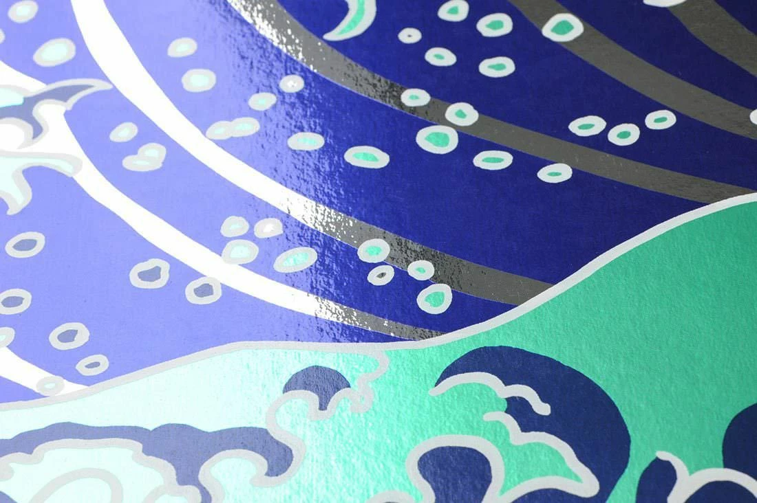 Die wohl berühmteste Darstellung einer Welle, neu interpretiert im Stil der Pop Art: Das Design des New Yorker Herstellers Flavor Paper basiert auf dem japanischen Holzschnitt „Die große Welle vor Kanagawa“. In kraftvollen Grün-, Türkis- und Blautönen greift die Vliestapete die Farben und die Dynamik des Meeres auf. Dabei bleibt die detailgetreue Darstellung der Riesenwelle unverkennbar. Die Mindestabnahmemenge beträgt drei Rollen.