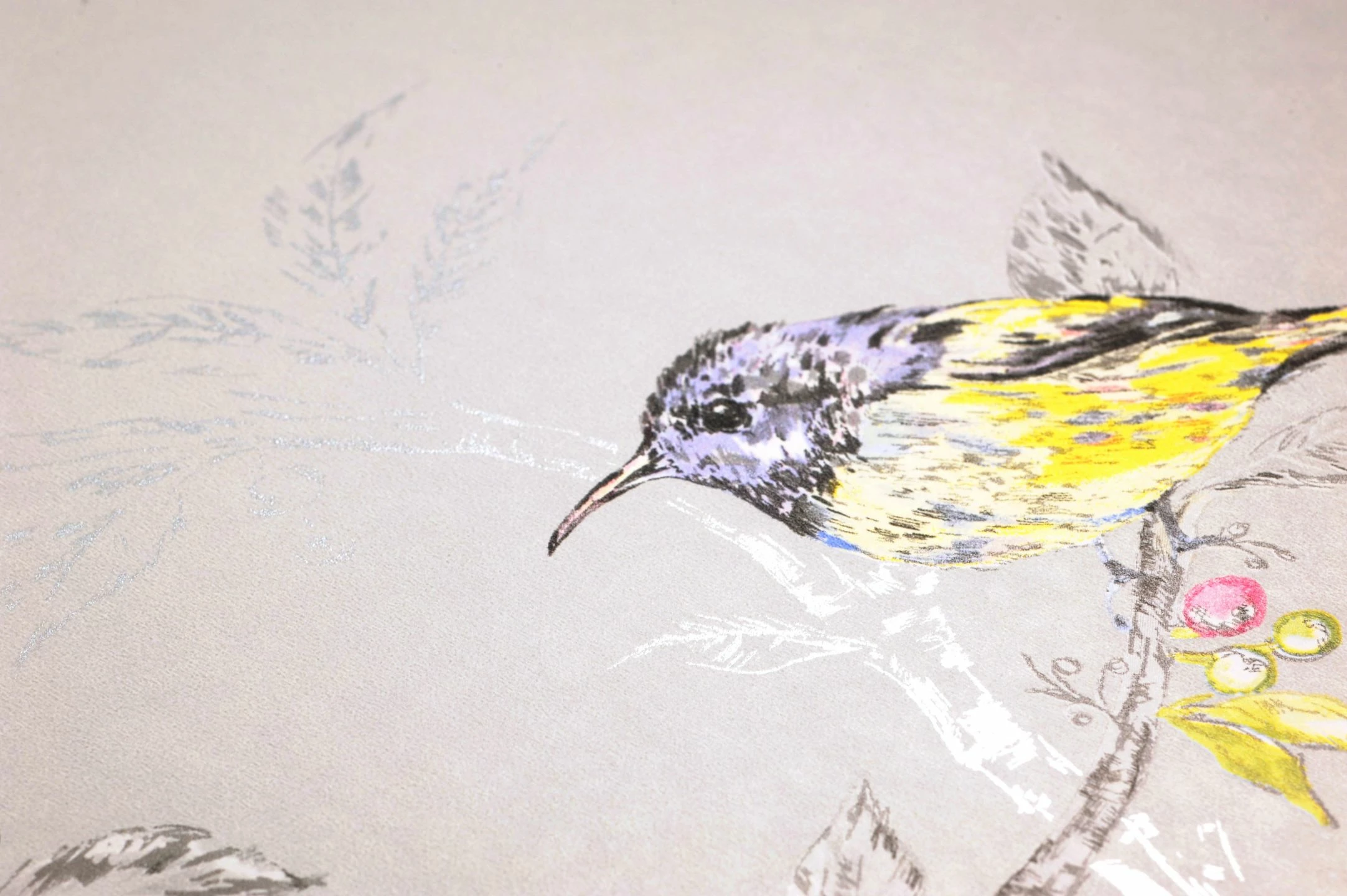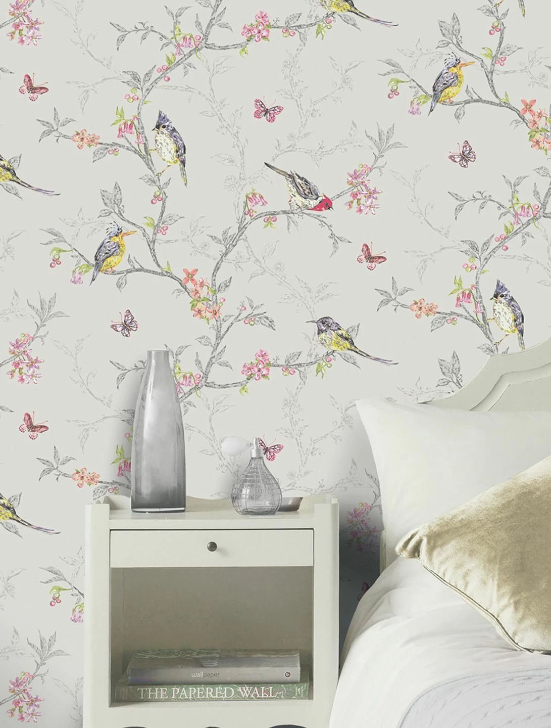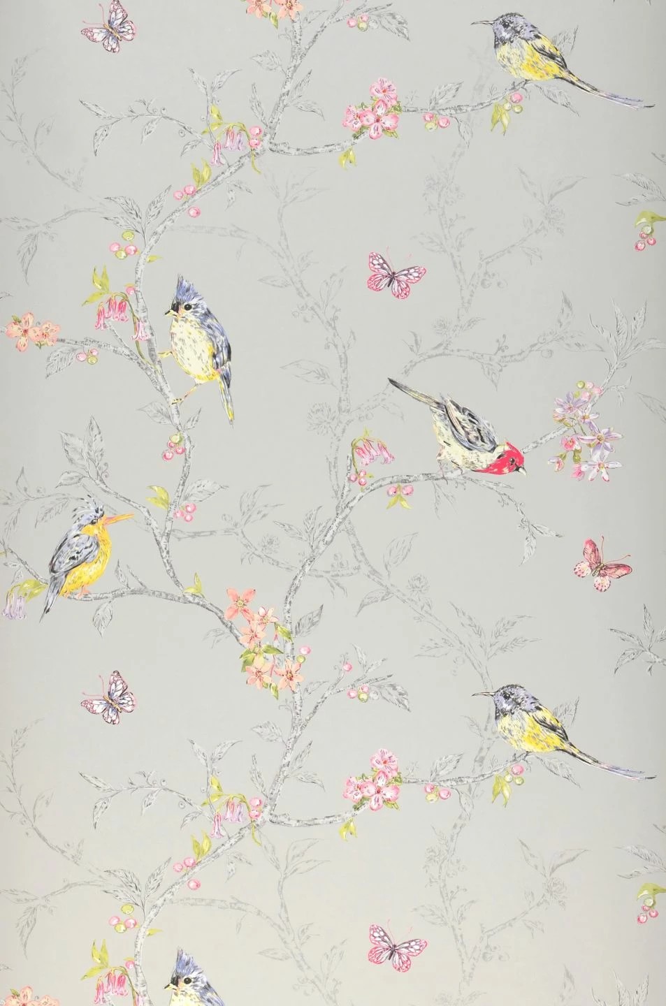 Die geschickte Farbgebung der Tiermotiv-Tapete Onni lenkt den Blick auf die farbenfrohen, zierlichen Vögel, die Schmetterlinge und Blüten in Rosatönen. Denn die Zweige, auf denen die Vögel sich tummeln, sind in verschiedenen Grautönen dargestellt. So entsteht der Eindruck räumlicher Tiefe, während das bunte Leben im Vordergrund verortet ist. Besonders schön wiedergegeben ist die flauschige Struktur des Gefieders der Singvögel, die man fast zu hören meint.