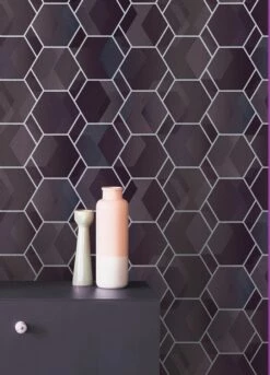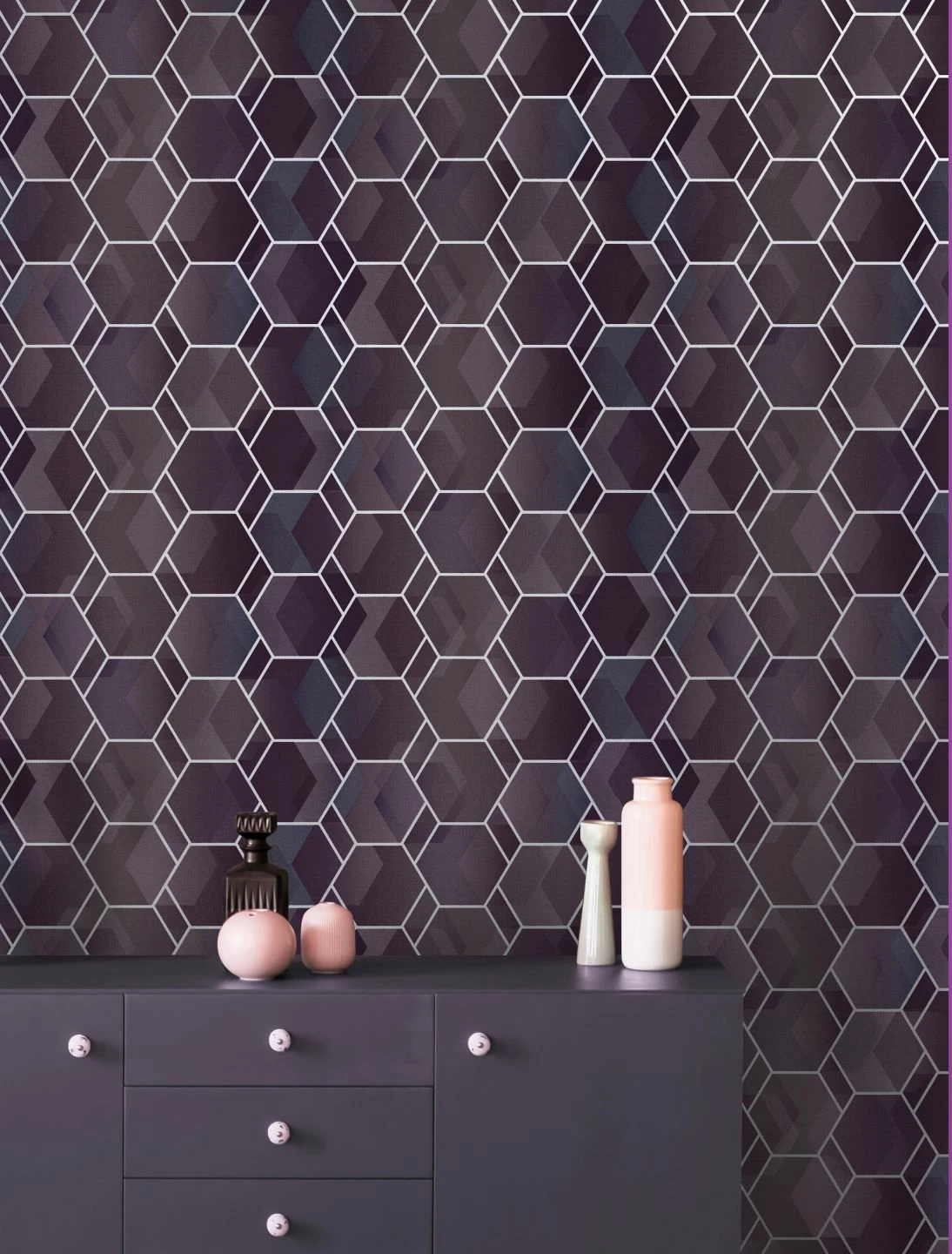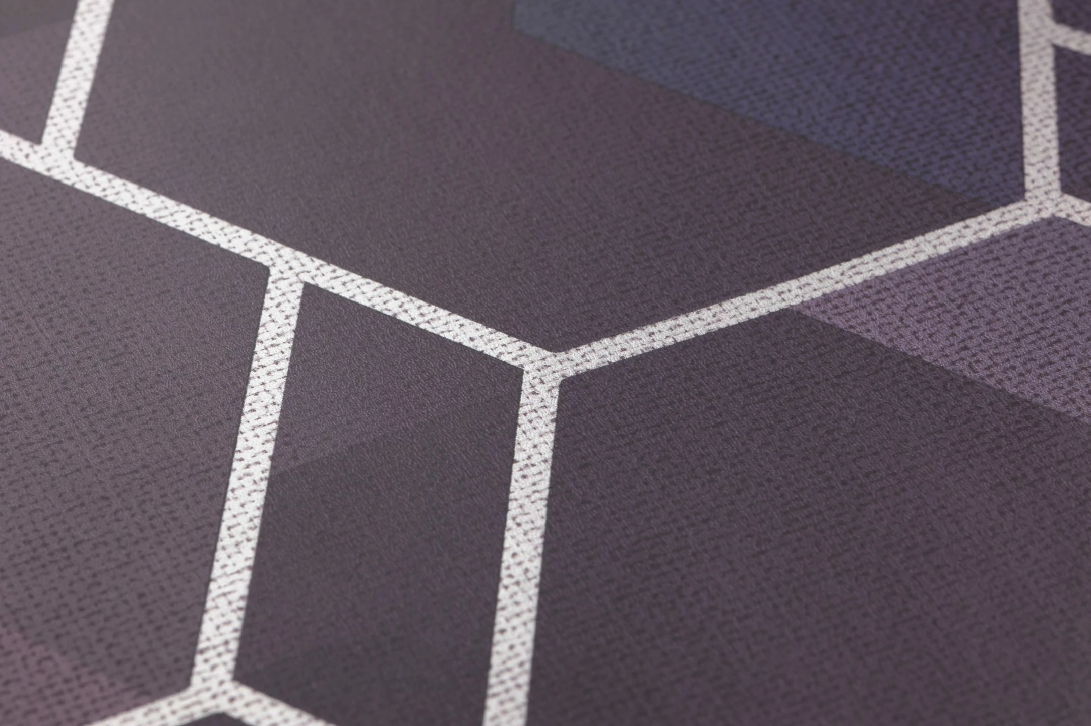Raffiniert eingesetzte Schattierungen von Violett auf dem glatten Untergrund mit dezenter Bastmatten-Optik bilden Hexagone und Rauten, die durch unterschiedliche Abstufungen der Helligkeit räumliche Tiefe andeuten. Wie im Vordergrund darüber liegend, betont ein Netz aus schimmernden silbernen Linien die geometrischen Formen. Die angenehmen dunklen Farbtöne schaffen eine entspannte, ruhige Atmosphäre in Ihrem Raum.