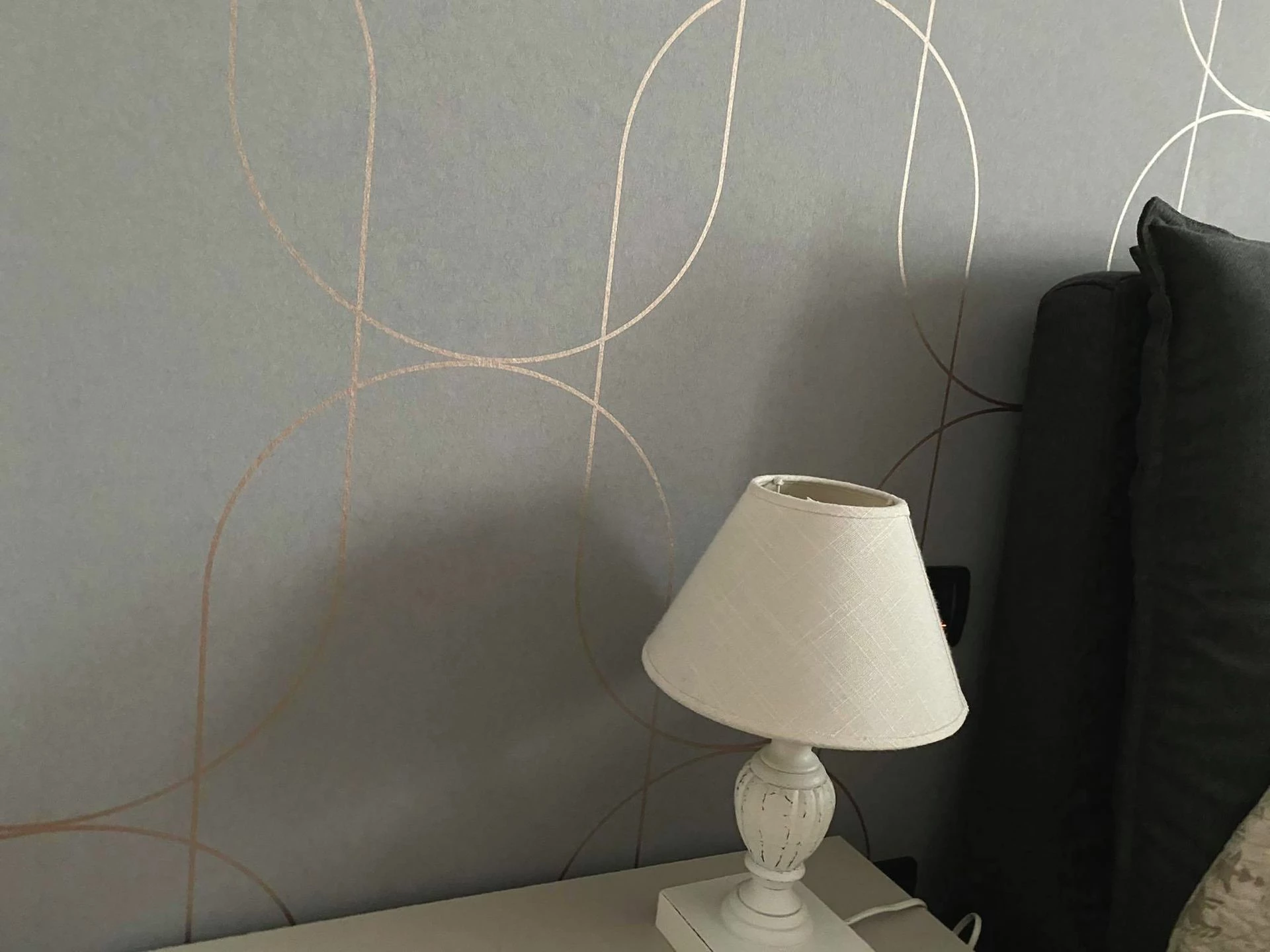 Art Deco in Perfektion: Klare, feine Linien in einem raffinierten, schimmernden Roségold auf einem Untergrund, der in einem sanften Hellgrau gehalten ist. Die goldenen Linien formen sich überschneidende Ovale und erzeugen ein großflächiges, dezentes Muster. Die Ästhetik des Art Deco verströmt eine zeitlos elegante Atmosphäre – egal ob in einem repräsentativen Wohnzimmer, in einem sachlich-schlichten Büro oder in einem Schlafzimmer.
