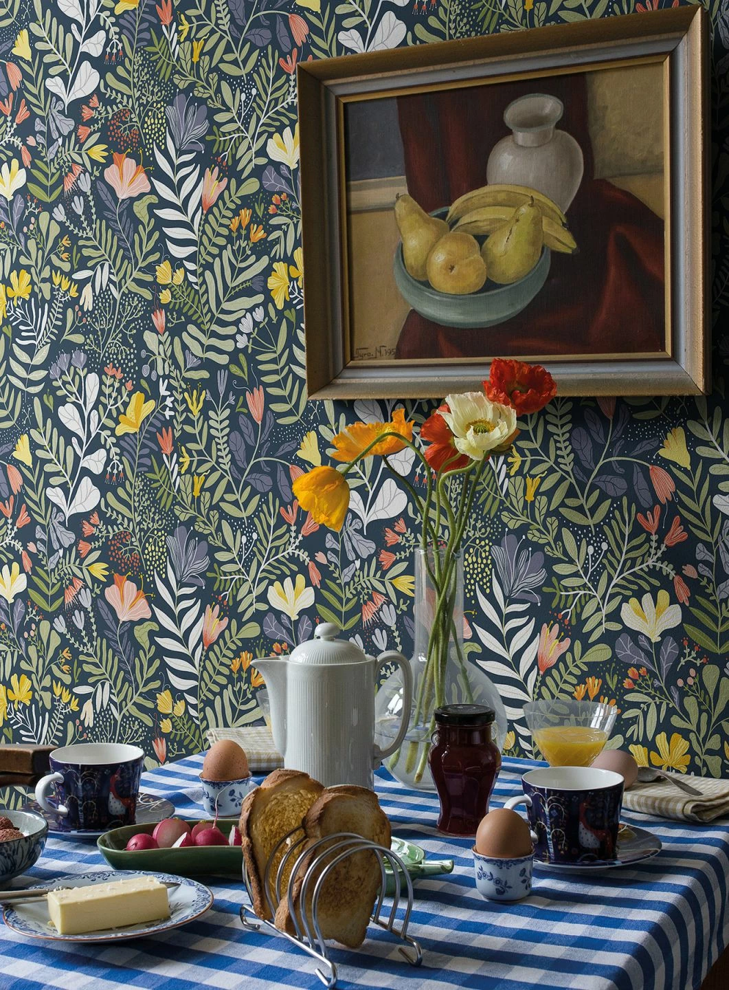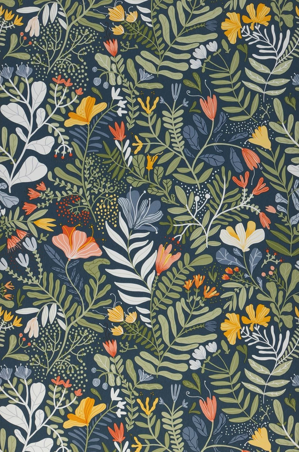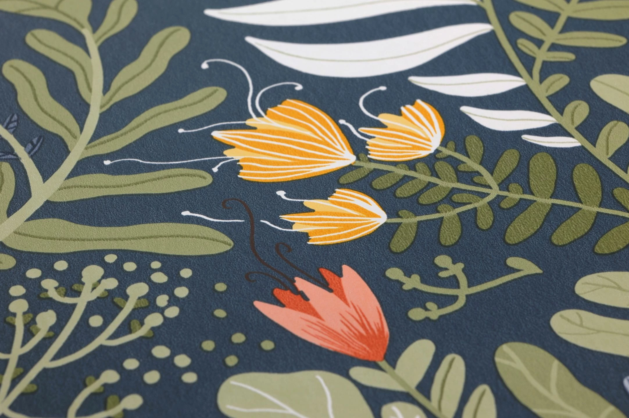 Ein Blumenmeer in den verschiedensten Formen bedeckt diese Vliestapete über und über. Auf dem ruhigen, graublauen Untergrund scheinen die kräftig roten, gelben, blauen und weißen Blüten wie von selbst zu leuchten. Die Farben bringen die ganze Lebenskraft des Sommers in Ihr Zimmer und erlauben vielfältige Kombinationsmöglichkeiten.