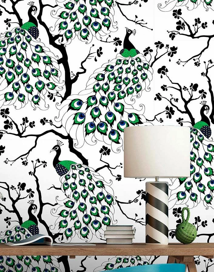 Spektakulär schön präsentiert sich Design Tapete Peacock mit stolzem Pfauenmuster. Das Label Dupenny aus England liebt es Schwarz auf Weiß mit farbigen Highlights, wie auch an dieser extravaganten Kreation zu erkennen ist. Die Liebe zum Detail, die sich in der Ausarbeitung des Federkleids zeigt wird mit spielerischer Leichtigkeit umgesetzt.