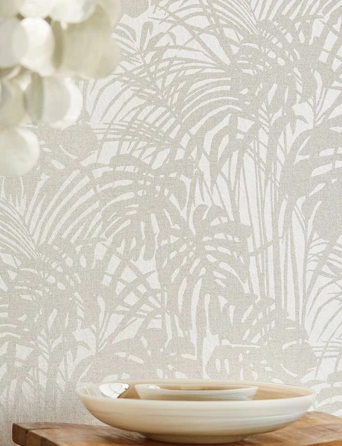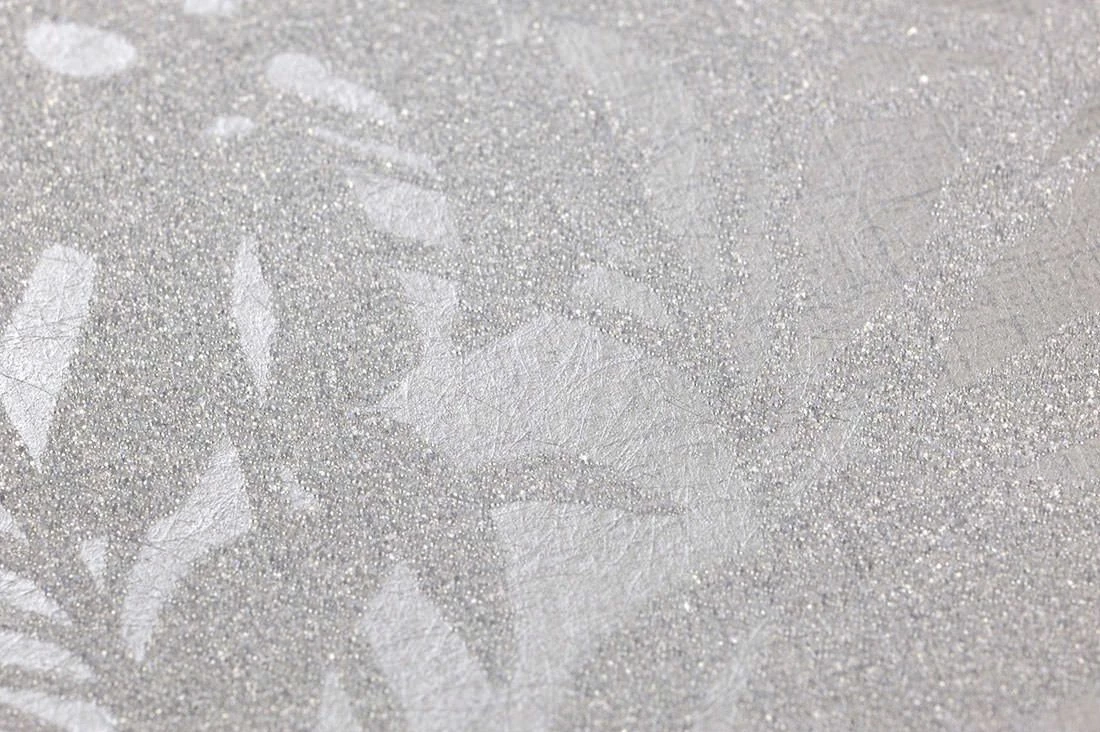 Grauweiss und Silbergrau Glitzer bilden die Farbwelt ab, in der Luxus Tapete Persephone dem exotischen Glamour die funkelnde Krone aufsetzt. Die Palmzweige sind mit unzähligen Glasperlen besetzt, die glanzvoll im Licht schimmern.