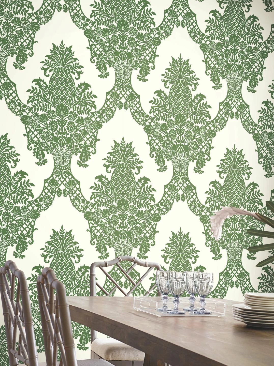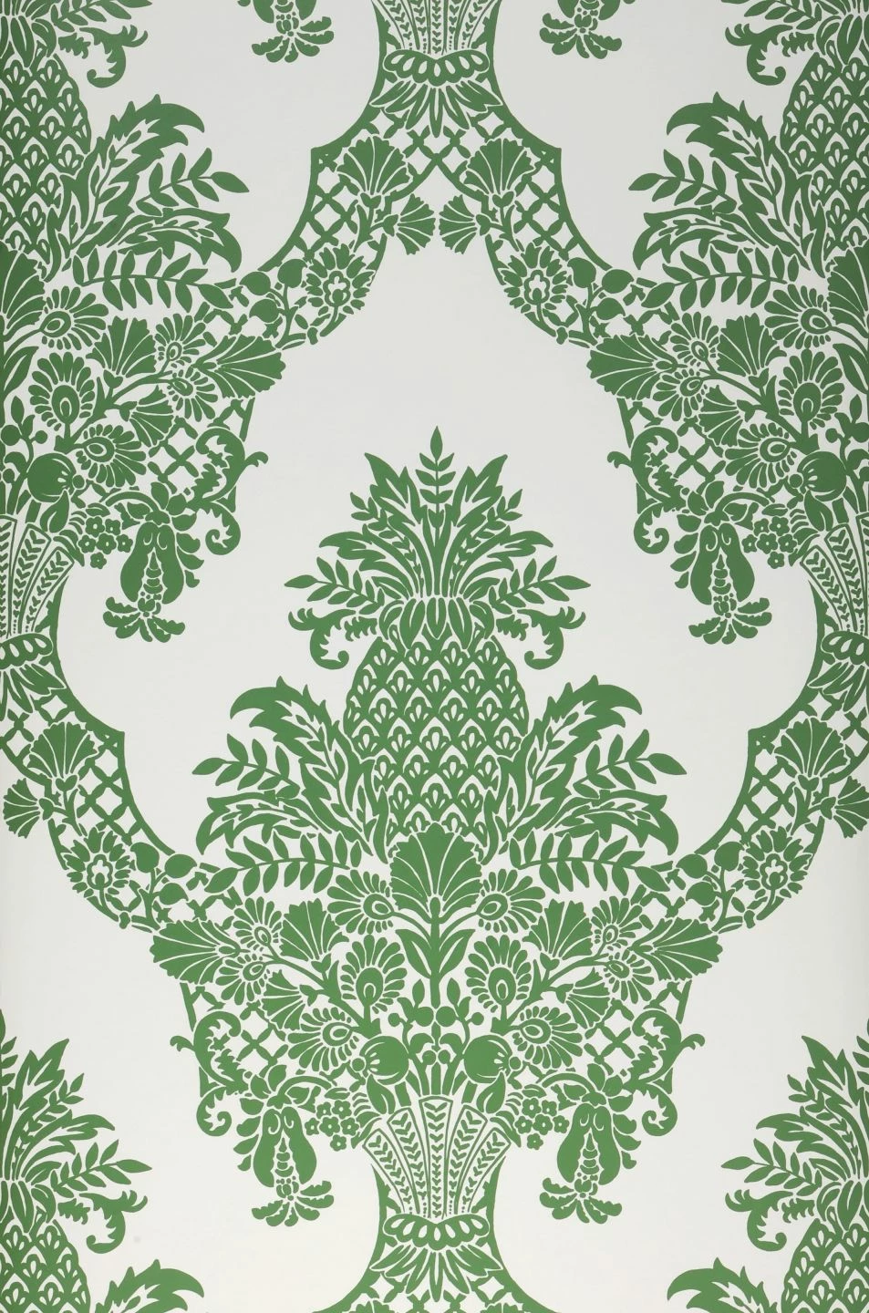 Im Mittelpunkt stehen Ananasfrüchte, mit Blumen und Blättern zu einem klassischen Barockmuster arrangiert. Das gedeckte Laubgrün des Musters kontrastiert angenehm mit der weißen Grundfarbe und hebt die filigranen, stilisierten Blütenarrangements kunstvoll hervor. Aufwändig und in der Konzentration auf zwei Farben unaufdringlich, schmückt die hochwertige Papiertapete Ihr gestyltes Esszimmer oder Ihr Wohnzimmer mit antiken oder auch modernen Möbeln.