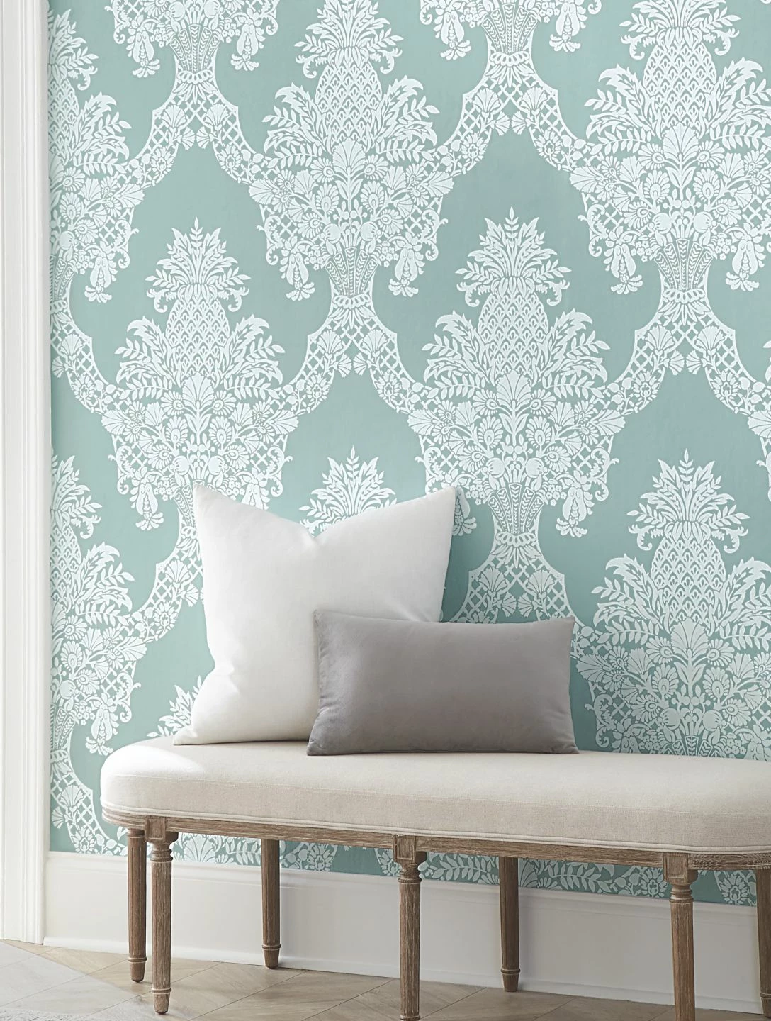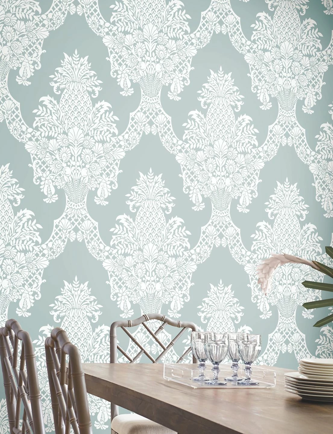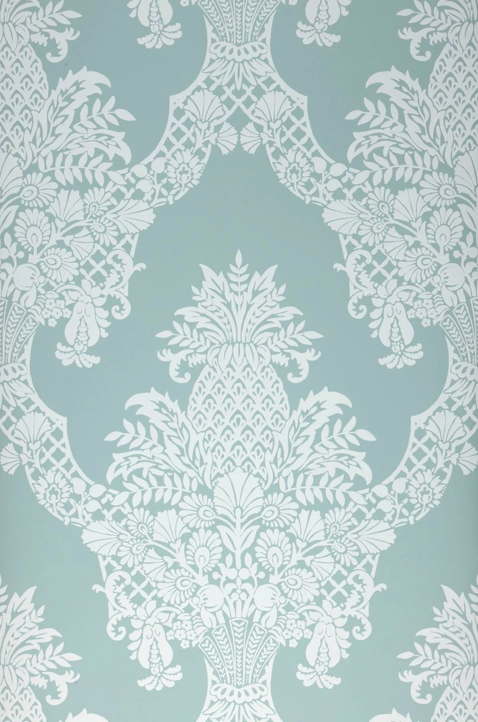 Wie das eingewebte Muster einer feinen Damasttischdecke sieht das weiße Barockmuster auf dem hellen, pastelltürkisfarbenen Untergrund aus. Die aufwändigen Arrangements aus Ananasfrüchten, Blüten und Blattranken, verbunden durch geschwungene Gittermuster, behalten durch die helle Farbwahl eine ganz unbarocke Leichtigkeit und verschönern Ihr Wohn- oder Esszimmer mit klassischen oder modernen Möbeln auf edle, aber dezente Weise.