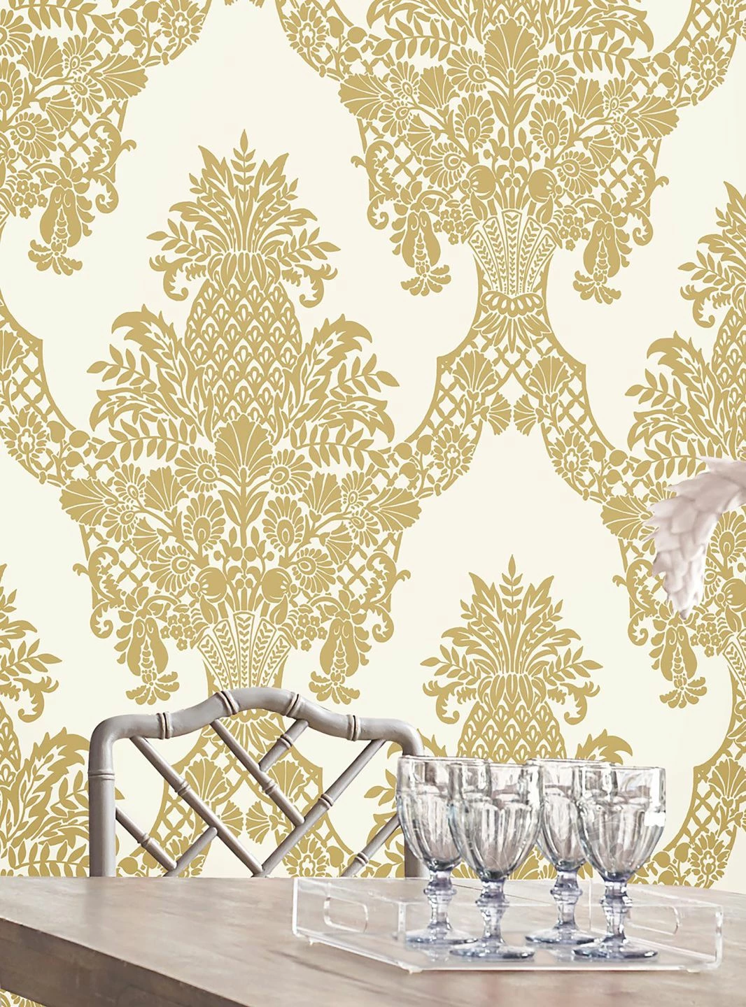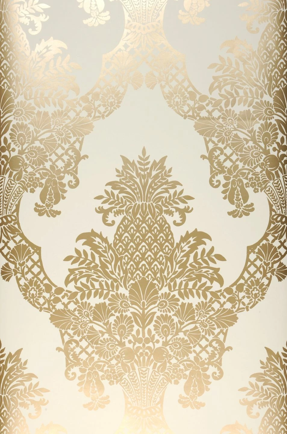 Das barocke Muster aus Ananas, Blüten- und Blattornamenten ist ganz in schimmerndem Perlgold auf mattem weißem Grund gehalten und lässt Ihr Esszimmer wirken wie ein Speisesaal in einem Schloss. Scherenschnittartig fügen sich die filigranen Blumenornamente, die durch geschwungene Gittermuster verbunden sind, zu einer edlen Komposition zusammen. Mit der Papiertapete Pineapple Damask fügen Sie Ihren Räumen ein wenig Luxus hinzu.