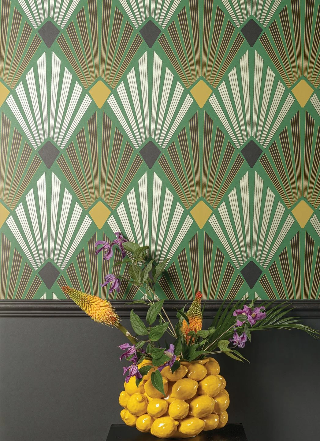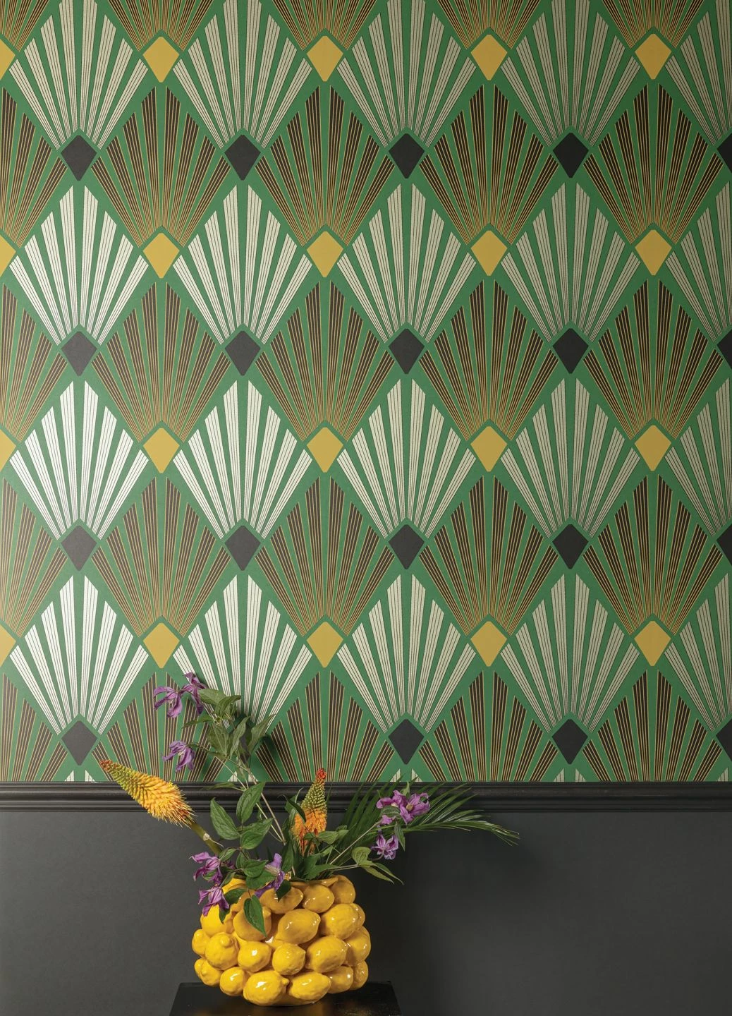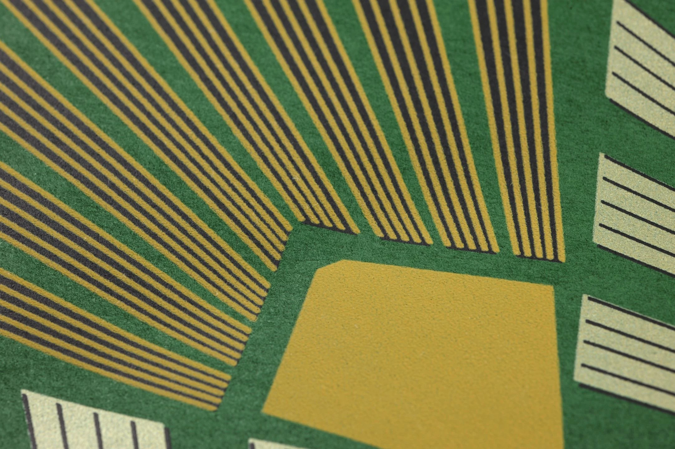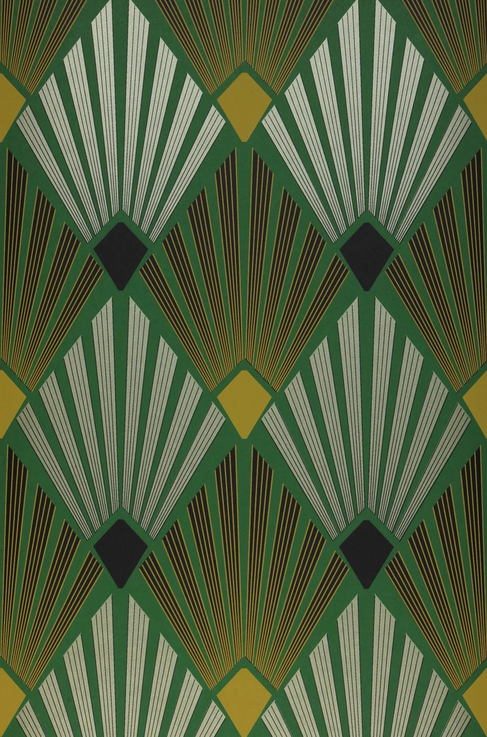 Die kühle, gestylte Eleganz des Art Deco hat seit ihrer Blütezeit nichts an Wirkung eingebüßt. Mit ihren typischen fächerförmigen Elementen aus sich verbreiternden Strahlen, unterstützt vom leuchtenden Gelb und Weiß auf dem grünen Hintergrund, strahlt Pontinius eine positive Dynamik und Aufbruchsstimmung aus. Das extravagante Design bringen Sie mit Vintage-Möbeln aus der Zeit des Art Deco zur Vollendung.