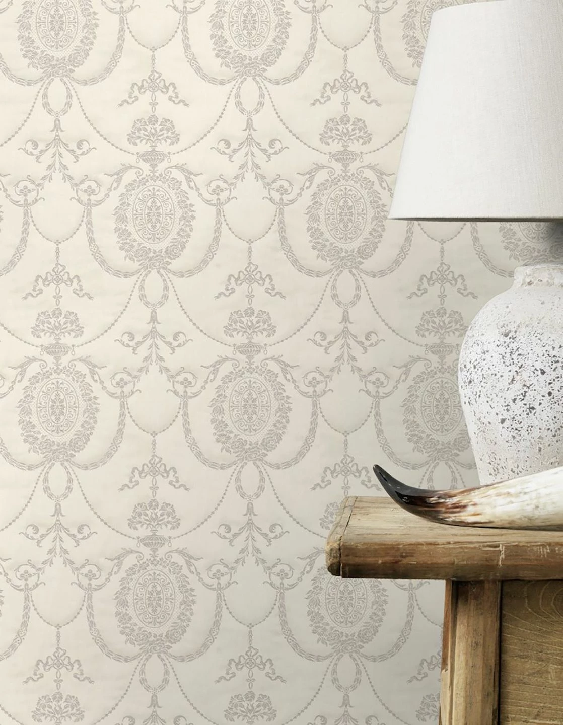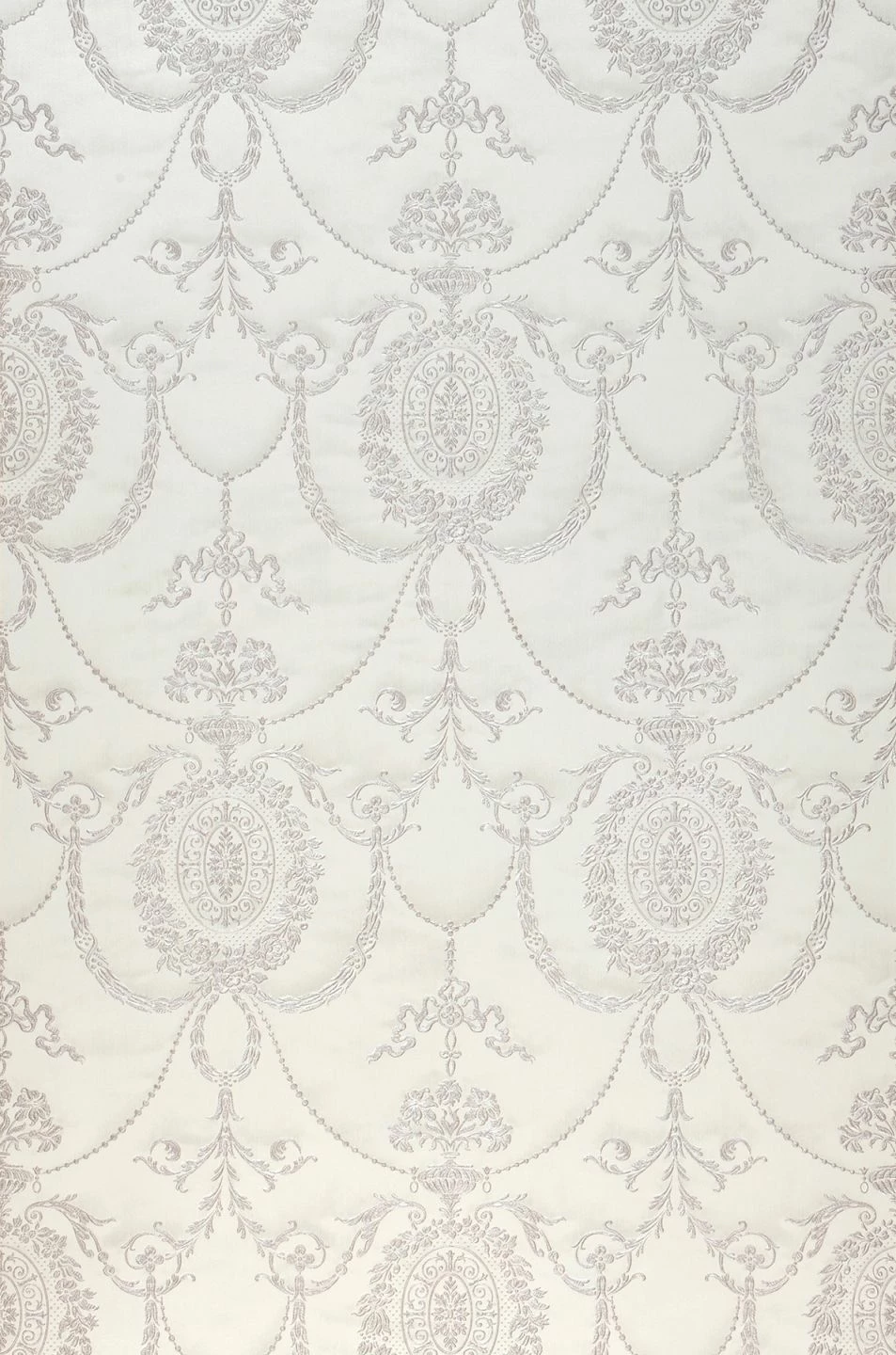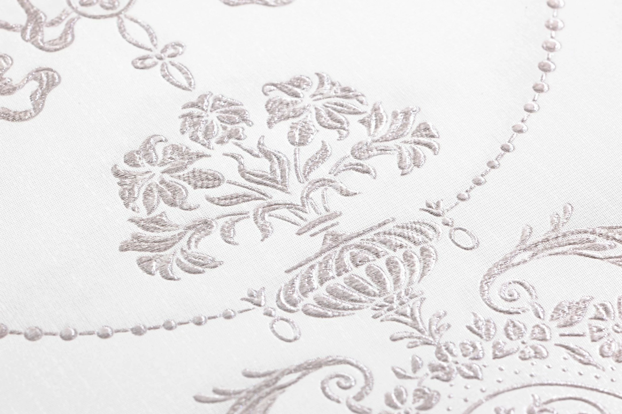 Vorhang auf für dieses barocke Meisterstück in Weißtönen zur Gestaltung königlicher Wände. Wie ein textiles Kunstwerk aus adeligen Gemächern mutet die pflegeleichte und robuste Vinyltapete an, die vielseitig einsetzbar ist. Die schimmernde Optik unterstreicht die reliefartigen Ornamente, welche an erlesene Stickereien erinnern.