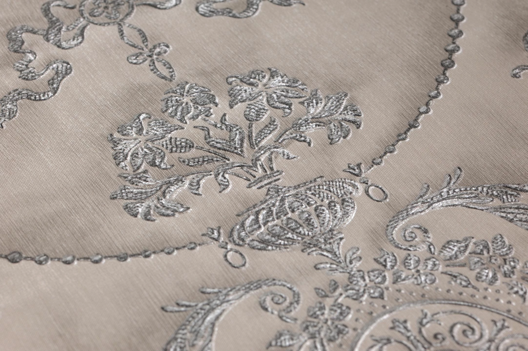 Ganz mühelos gelingt der Vliestapete Rabia die Gratwanderung zwischen klassischer Tradition und modernem Design. Denn das leicht schimmernde Hellbraungrau ist nicht nur angesagt, sondern erinnert zugleich an wertvolle Seidenstoffe. Die barocken Ornamente sind wie eine kostbare Stickarbeit in die unempfindliche Vinyloberfläche eingeprägt. Optisch wie haptisch entsteht der Eindruck eines luxuriösen und gleichzeitig vornehm zurückhaltenden Brokats.