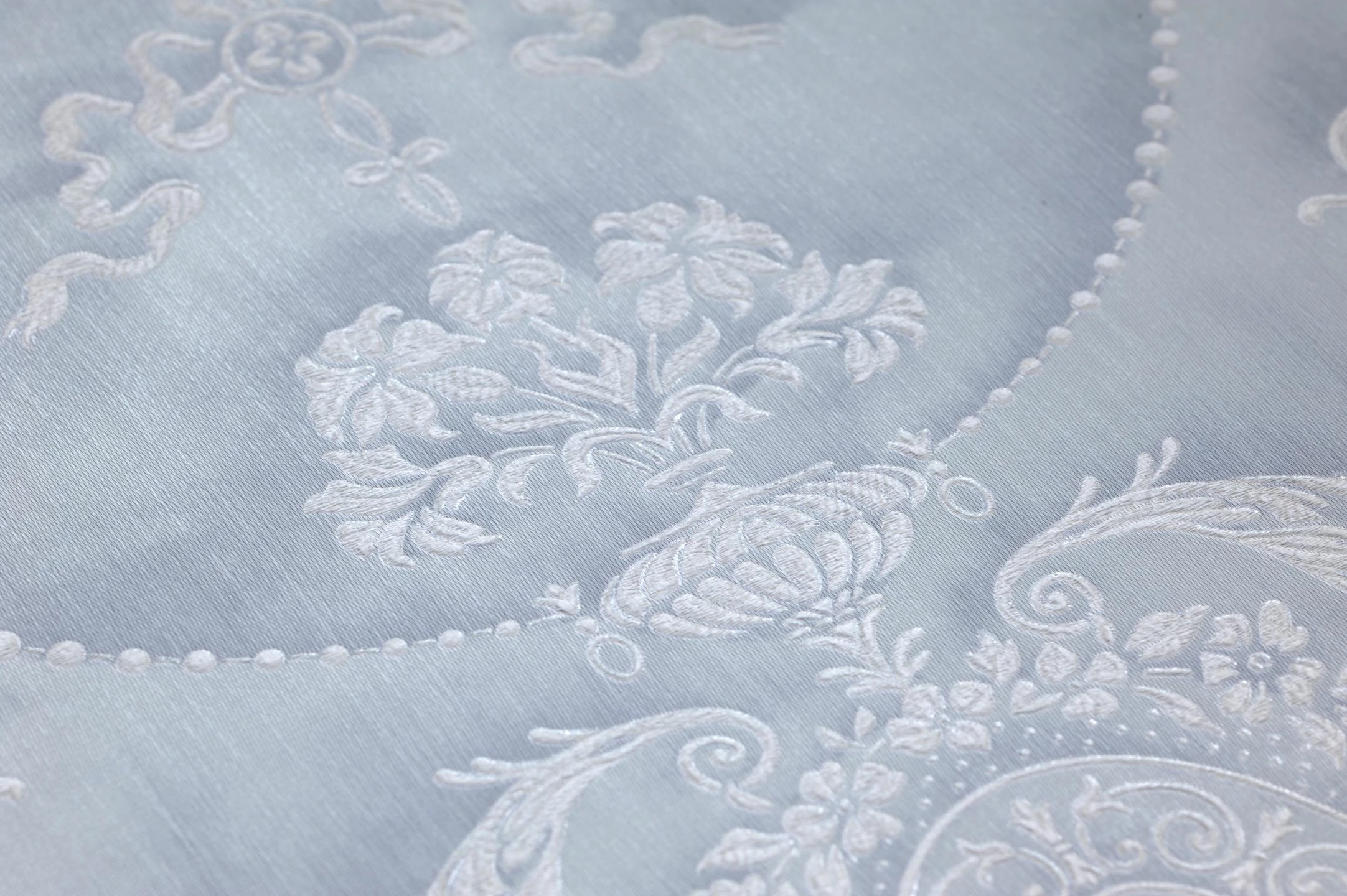 Kühle, zeitlose Eleganz verströmt das helle, leicht schimmernde Grau der beeindruckenden Barocktapete Rabia. In das Vinyl der Oberfläche ist ein ausladendes klassisches Tapetenmuster aus feinen stilisierten Blüten und Blattranken eingearbeitet. Wie bei einem kostbaren handbestickten Stoff kann man die Ziernähte fühlen, zwischen denen sich der Stoff hervorzuwölben scheint. Rabia betont die Größe Ihres Raums und schafft eine edle Atmosphäre.