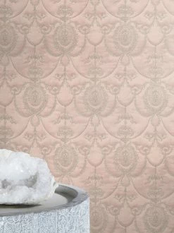 Wie das Gemach einer Prinzessin wirkt ein Raum, den die zartrosafarbene Vliestapete Rabia schmückt. Wie handgestickt in einen kostbaren Wandbehang sind barocke Ornamente in das Vinyl ihrer Oberfläche eingeprägt. Die fühlbare, an eine Textiloberfläche erinnernde Struktur macht die Tapete zu einem überzeugenden Stück Luxus für ein romantisches Schlafzimmer, ein edles Wohnzimmer oder ein verspieltes Mädchenzimmer.