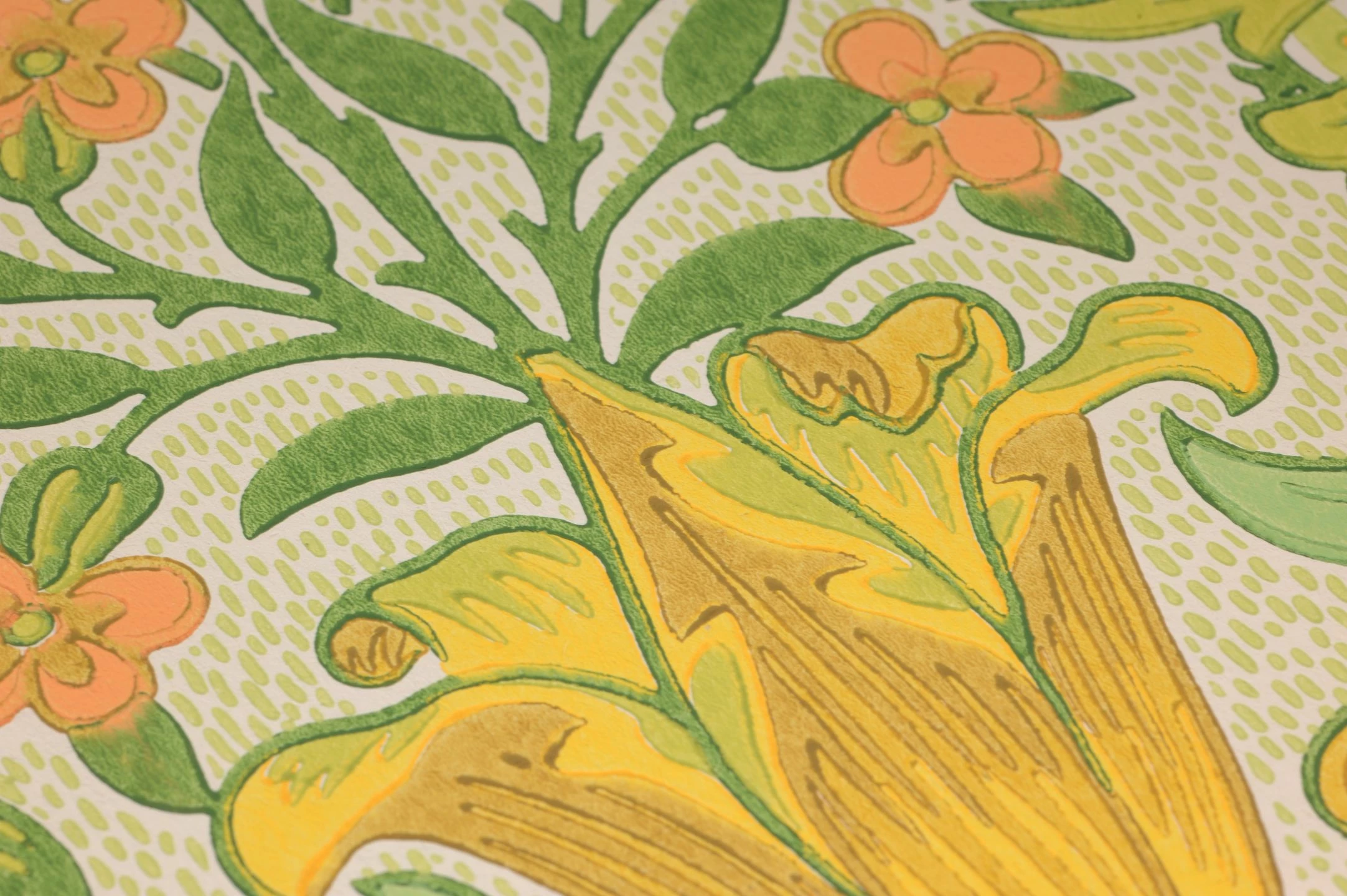Voller leuchtender Gelb- und Grüntöne auf dem zart gemusterten Grund bringt Rebecca frühlingshaftes Sonnenlicht an Ihre Wände. Das historische Muster von Morris & Co., das dem britischen Designer John Henry Dearle zugeschrieben wird, vereint die stilisierten Blüten und Blattranken des Jugendstils mit den frisch leuchtenden Farben des Frühlings. Im Mittelpunkt stehen kräftig gelbe Tulpen, deren Blätter sich wie ein Feuerwerk vom Stängel her ausbreiten.