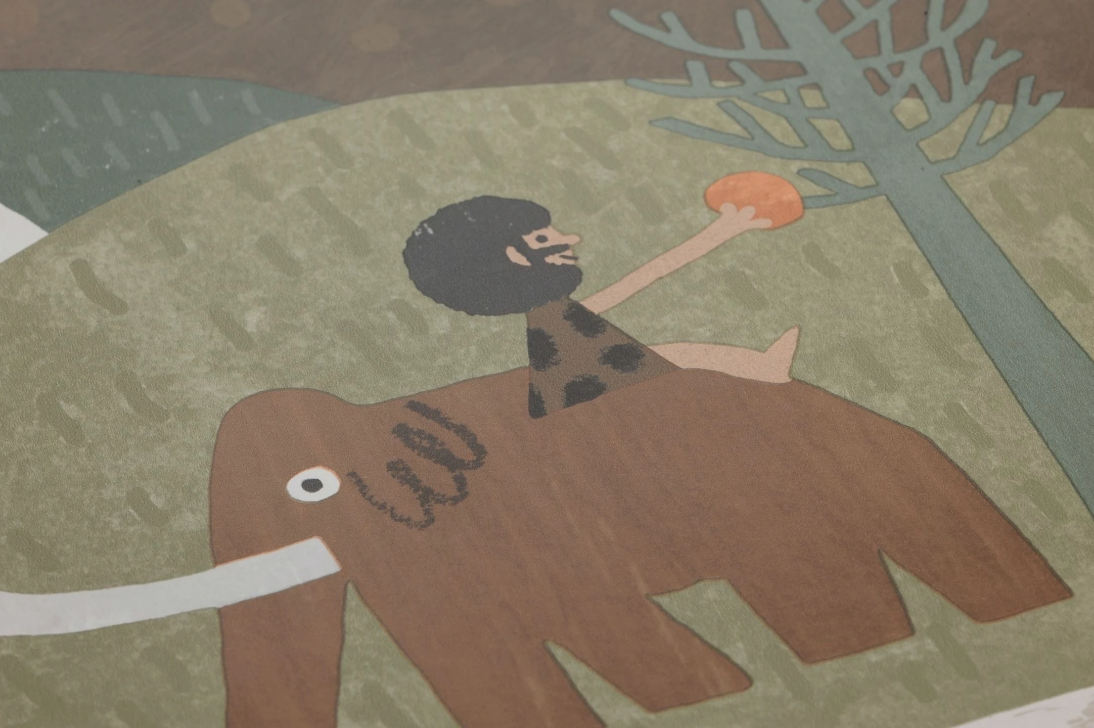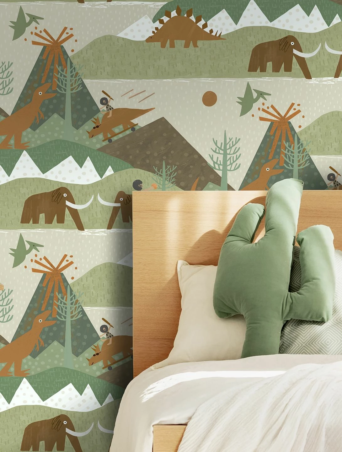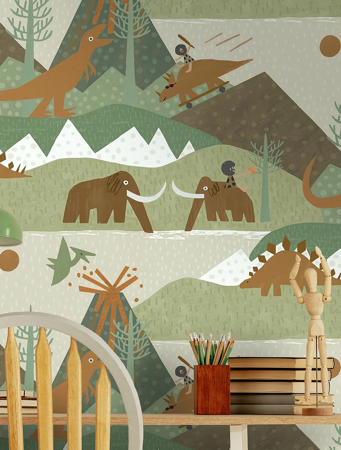 Hier leben verschiedene Dinosaurier, Urmenschen, Mammuts und Flugsaurier friedlich Seite an Seite – in einer Welt voller Berge, Bäume und Vulkane. Jedes Kind, das Dinosaurier liebt, wird sich über diese faszinierende Papiertapete in seinem Kinderzimmer freuen. Die Ästhetik der Urzeitwelt erinnert an Collagen und ist kindgerecht, phantasieanregend und freundlich mit einem großen Augenzwinkern gestaltet.