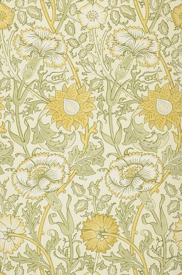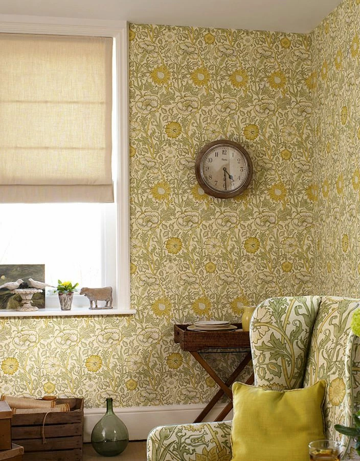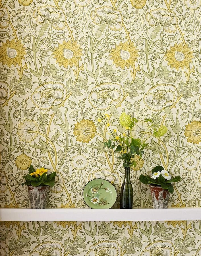 Die Farbwelt dieser Papiertapete von Morris & Co. besteht ganz aus Gelb- und Grüntönen auf cremeweißem Untergrund und erzielt so eine ungemein stimmige, harmonische Wirkung. Verschiedenste Blüten und Blätter wachsen über die Tapete – und wirken bei aller Stilisiertheit, die dem Jugendstil eigen ist, doch sehr lebendig. Denn zwischen frontal abgebildeten Blüten tauchen immer wieder solche auf, die sich vom Betrachter wegneigen.