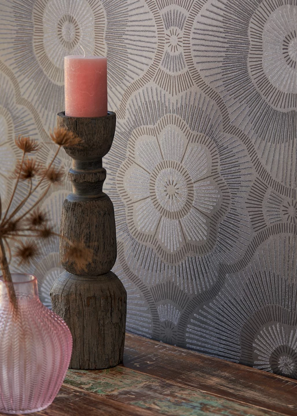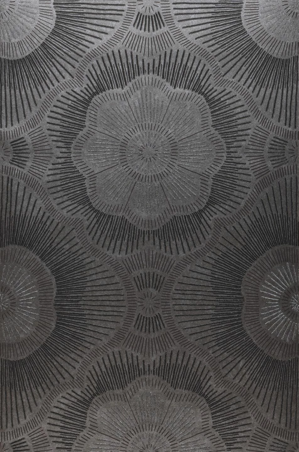 Blumenmuster einmal anders: Auf dem leicht schimmernden, graubraunen Untergrund bilden graue und dunkelbraune Linien ein Blütenmuster, das den Blick magisch anzieht. Eine faszinierende Wirkung geht von den großen stilisierten Blüten aus, die in wirkungsvollem Kontrast zu den ruhigen dunklen Farbtönen der Tapete stehen. Unzählige aufgeklebte Glasperlen reflektieren glitzernd das Licht und tragen zur besonderen Ausstrahlung der eleganten Vliestapete bei.