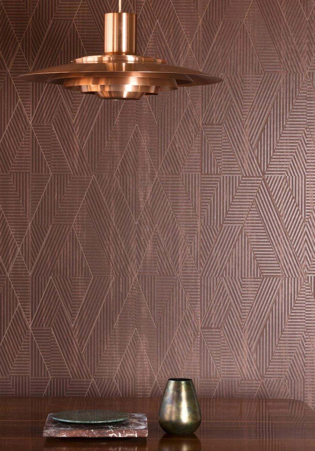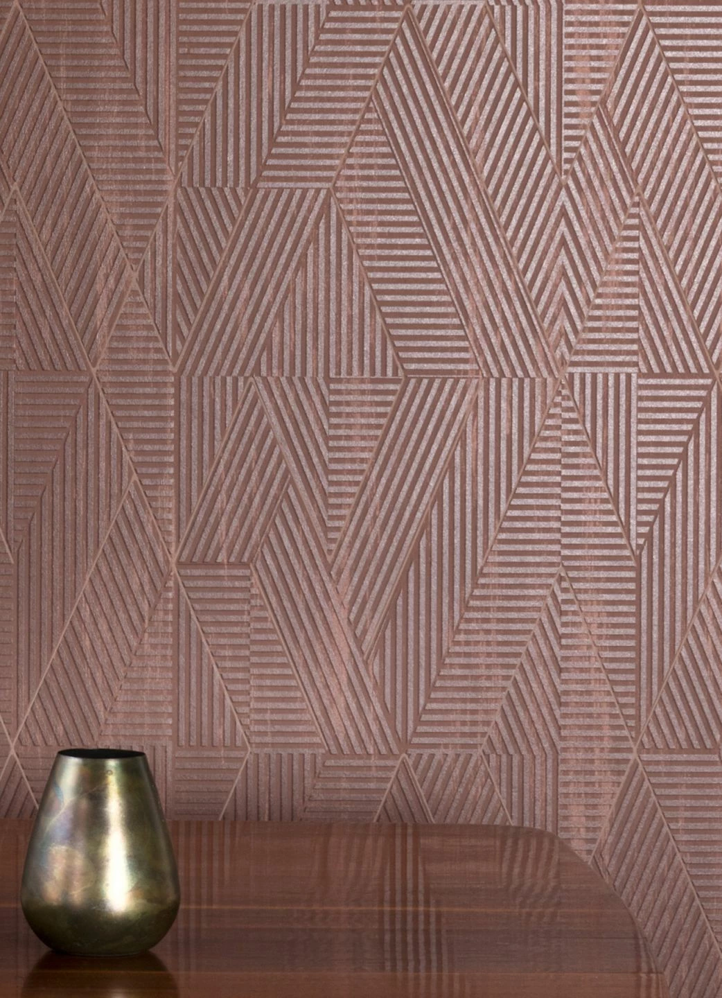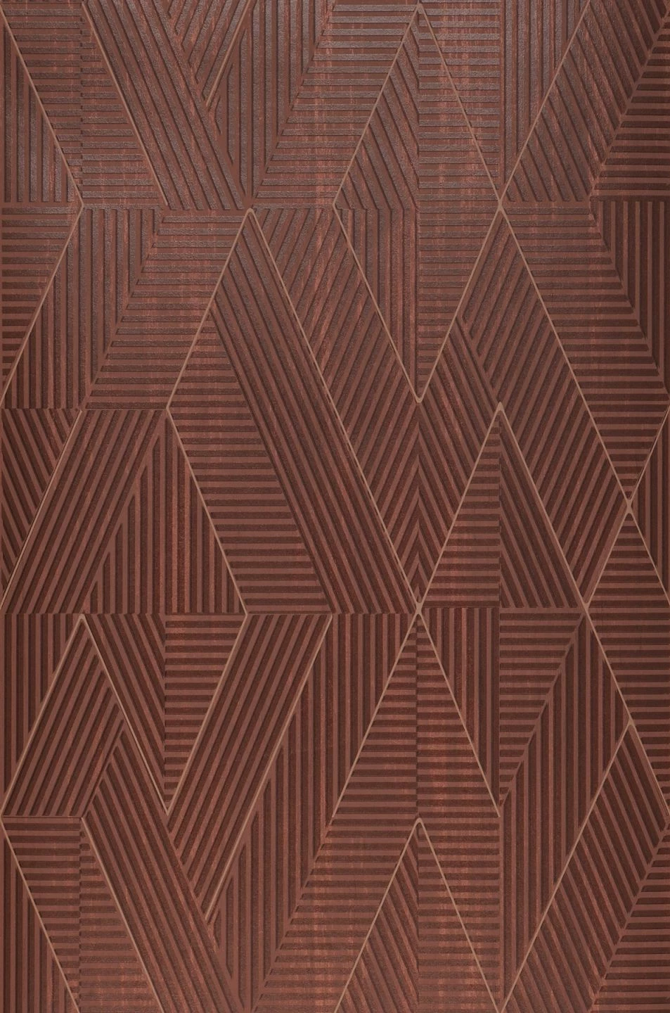 Illusionierende Geometrie: Streifendiagonalen werden in Richtung gelenkt, gerne kreuz und quer. So bilden sich ganze und halbe Rauten oder Dreiecke, manche von ihnen wirken dreidimensional. Ein Labyrinth der Möglichkeiten eröffnet sich dem Betrachter. Die Crème de la Crème der Brauntöne, von Schokoladenbraun über Nougatbraun Schimmer bis zu Weiß- und Blassbraun, gibt sich die Ehre.