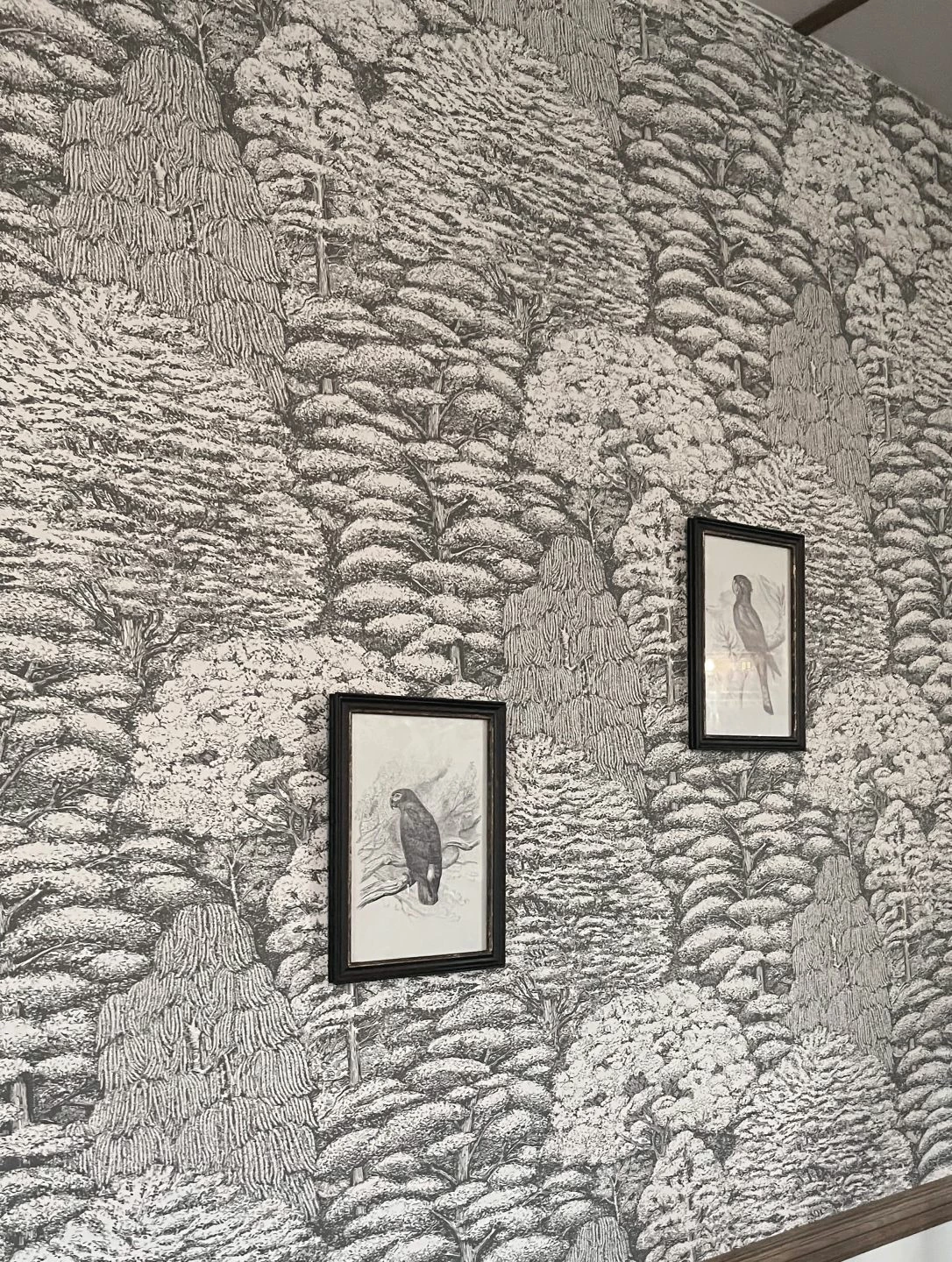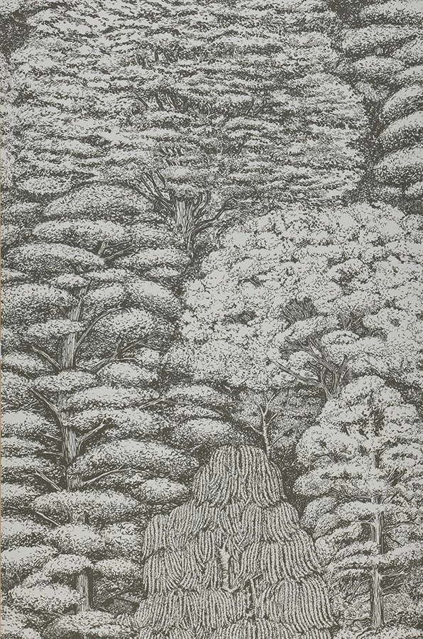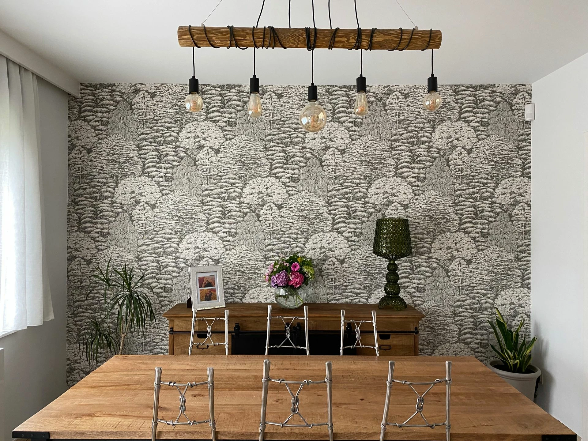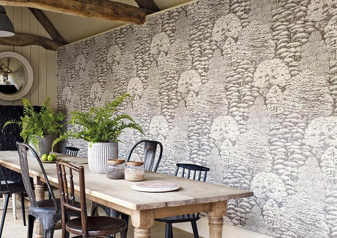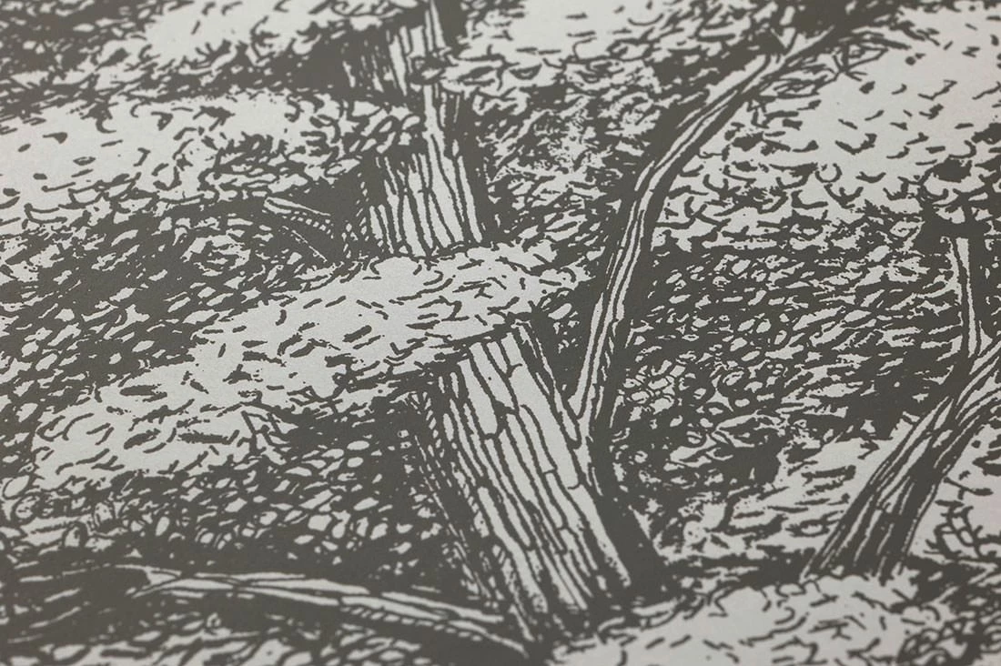 Ein dichter Wald voller hoher, alter Bäume – wie ein Kupferstich ist die Vliestapete „Roderik“ in nur zwei Farben gehalten. Braungraue sanfte Striche, Tupfer und Schraffuren auf cremeweißem Grund reichen aus, um eine ganze Waldlandschaft mit verschieden geformten Baumkronen, der Struktur der Rinde und die Illusion von tiefer Undurchdringlichkeit zu erschaffen. Möbel aus dunklem Holz bilden eine schöne Ergänzung zu dieser botanischen Tapete.