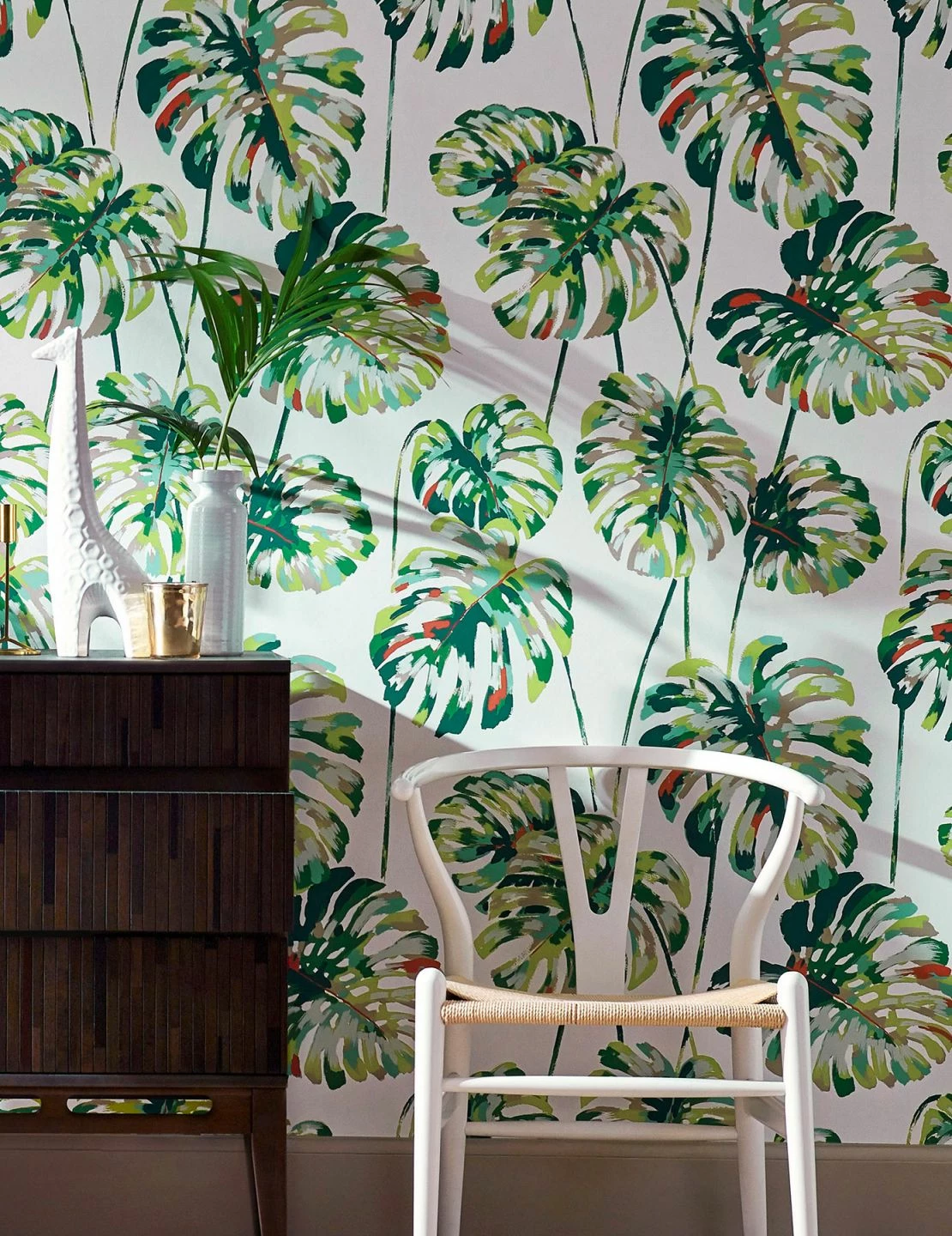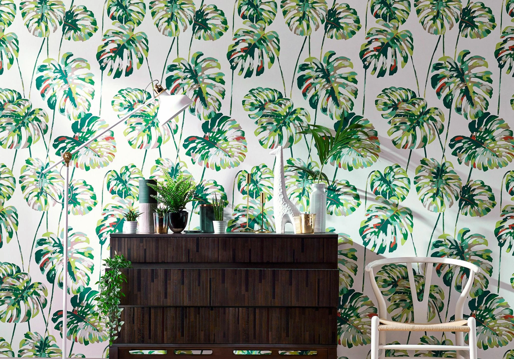 Prächtiges Grün gedeiht nicht nur in der Natur, sondern auch auf diesem floralen Musterstück. Die exotischen Blätter im Multicolor-Design auf weißem Fond wollen optisch bewusst in den Raum wachsen und eine dichte grüne Wohlfühloase bilden. Die waschbeständige Vliestapete mit glatter Oberfläche besticht auch durch ihr künstlerisch plakatives Design.