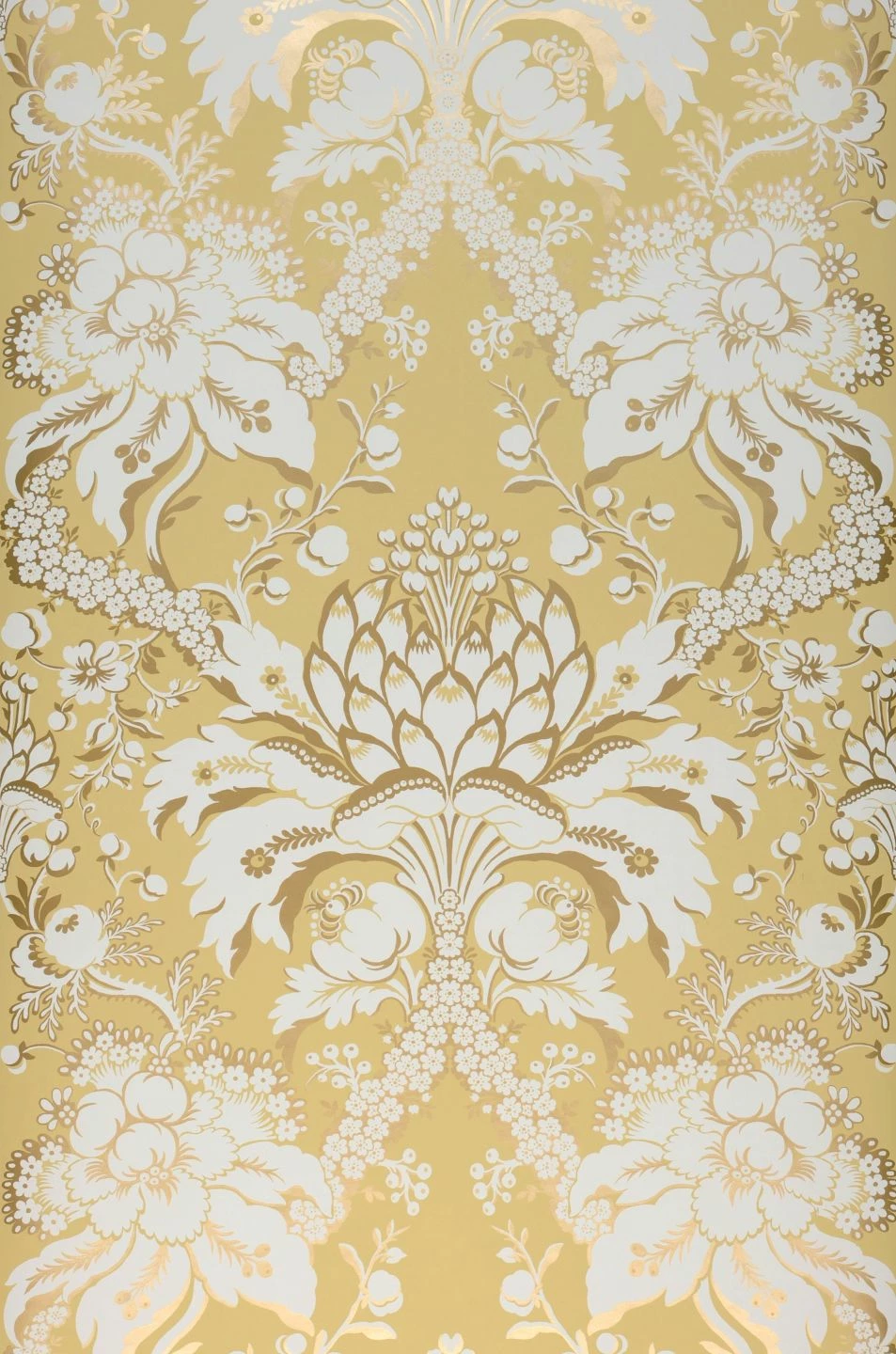 Besonders edel wirkt das barocke Tapetenmuster, das sich aus den Blütenständen der Artischocke entwickelt, durch die weißen und perlgoldfarbenen Elemente auf dem elfenbeinfarbenen Grund. Zwischen den Arrangements aus Artischocken und stilisierten Blättern schaffen Girlanden aus kleinen Blüten sowie locker dahingestreute Blumen eine Verbindung. Eine Tapete, wie geschaffen für ein klassisches Wohnzimmer mit hellen Möbeln oder mit dunklem Holz.