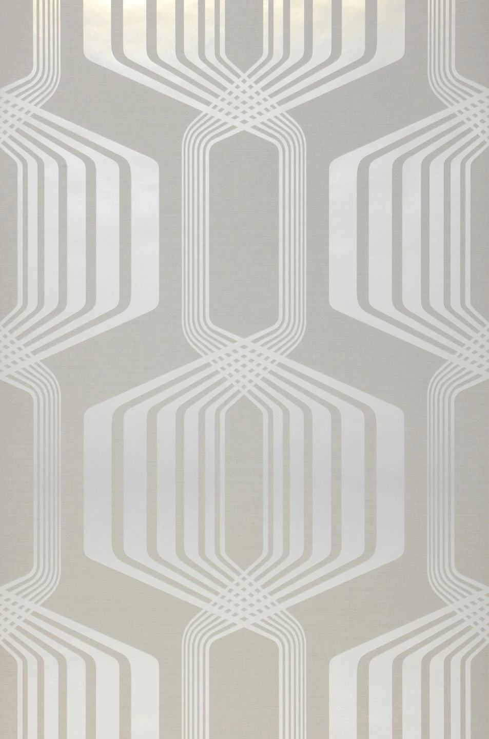 Die sich überkreuzenden verschieden breiten Linien und Balken in elegant schimmerndem Perlglanz-Weiß auf lichtem, weißgrauem Grund lassen an den Strahlengang von Lichtstrahlen durch ein Prisma denken. Das kräftige, an die 70er Jahre erinnernde Retro-Muster wirkt in der Farbkombination Weißgrau besonders elegant. In den ebenfalls erhältlichen Farbvarianten Dunkelblau und Graubraun entwickelt es einen jeweils anderen reizvollen Charakter.