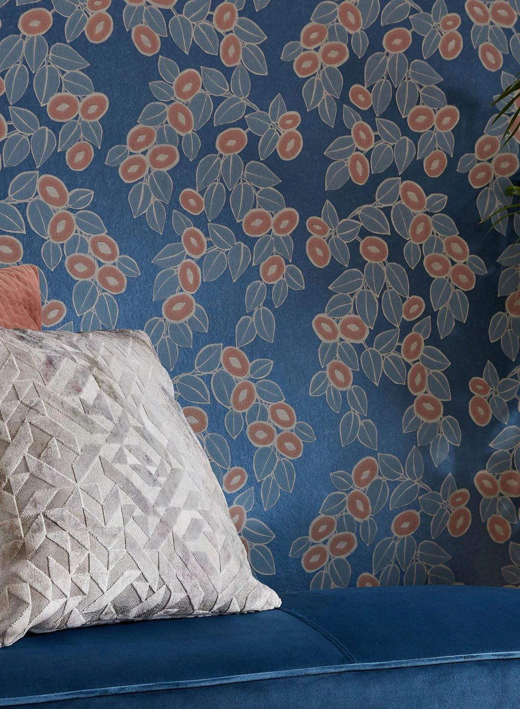 Stilisierte Blüten und Blätter in Azurblau und Rosé ranken sich über den blau schimmernden Untergrund. Helle kieselgraue Highlights lassen die Konturen fast plastisch hervortreten. Die Kombination von matten und glänzenden Elementen verleiht den Ranken im Spiel der einfallenden Lichtreflexe einen belebten Eindruck.