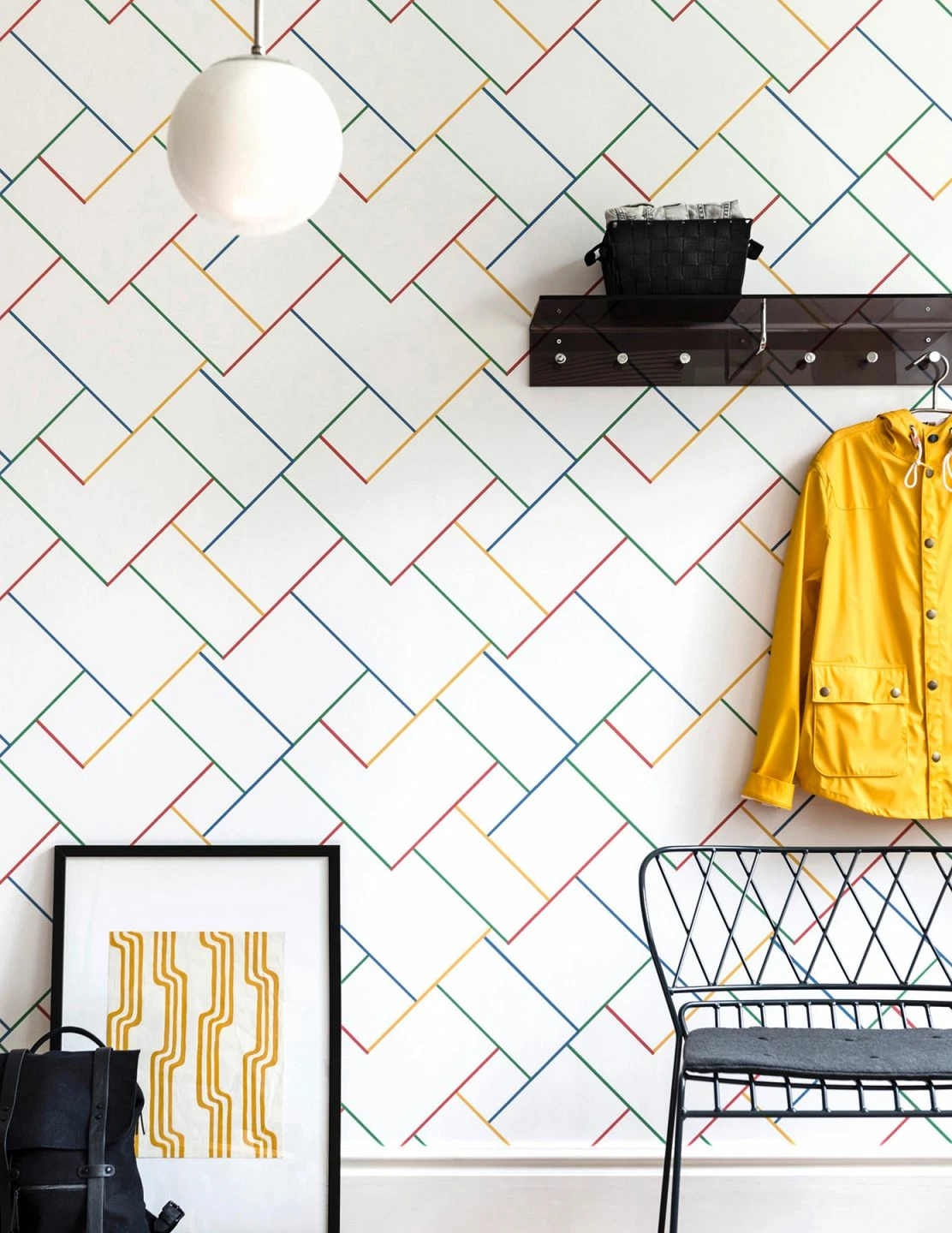 Frech in den Grundfarben Blau, Gelb, Grün, Rot und mit ungebremstem Tatendrang will dieses Geometriekunststück den Kreativraum erobern. Durch die geschickte Anordnung der farbigen Linien entsteht eine rasante optische Bewegung, die jeden mitreißt. Lassen Sie die Wand beben mit der leicht anzubringenden Vliestapete in matter Leimdruckoptik.