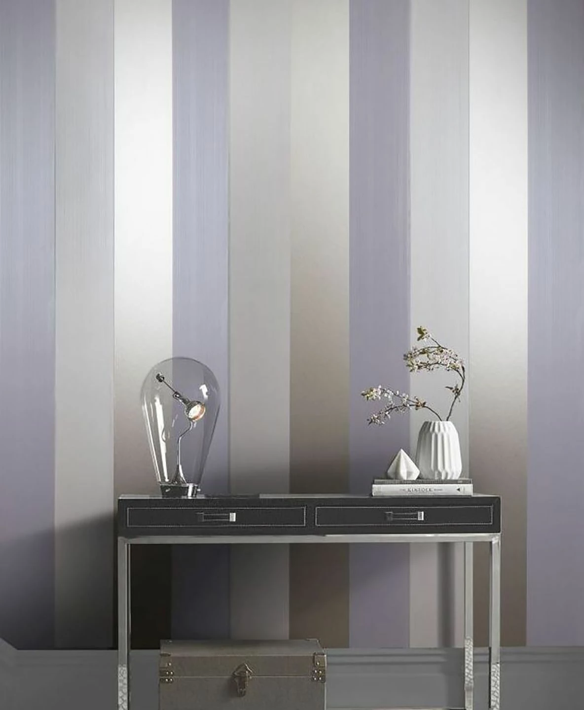 Surreal, futuristisch und doch von beeindruckender Eleganz zeigt sich die luxuriöse Streifentapete. Die Tonalität der Farben mit dem schimmernden Effekt fängt Licht ein und schafft reflektierende Momente, die das Auge mit spiegelndem Glanz begeistern. Diese Glamour Tapete liebt puristisch moderne Looks.