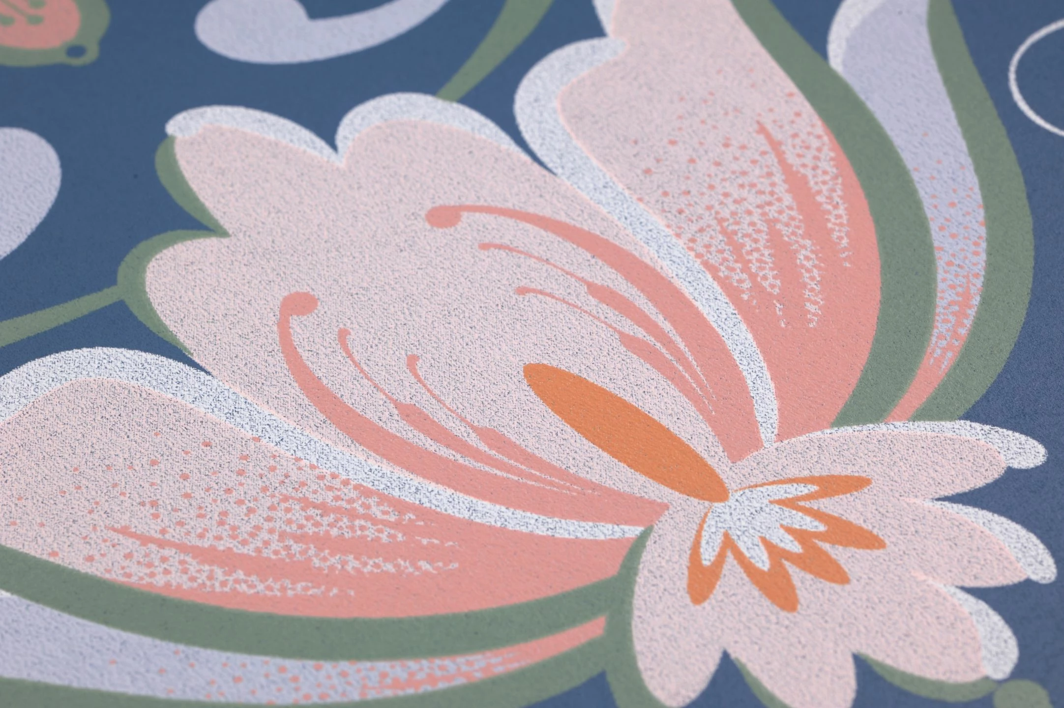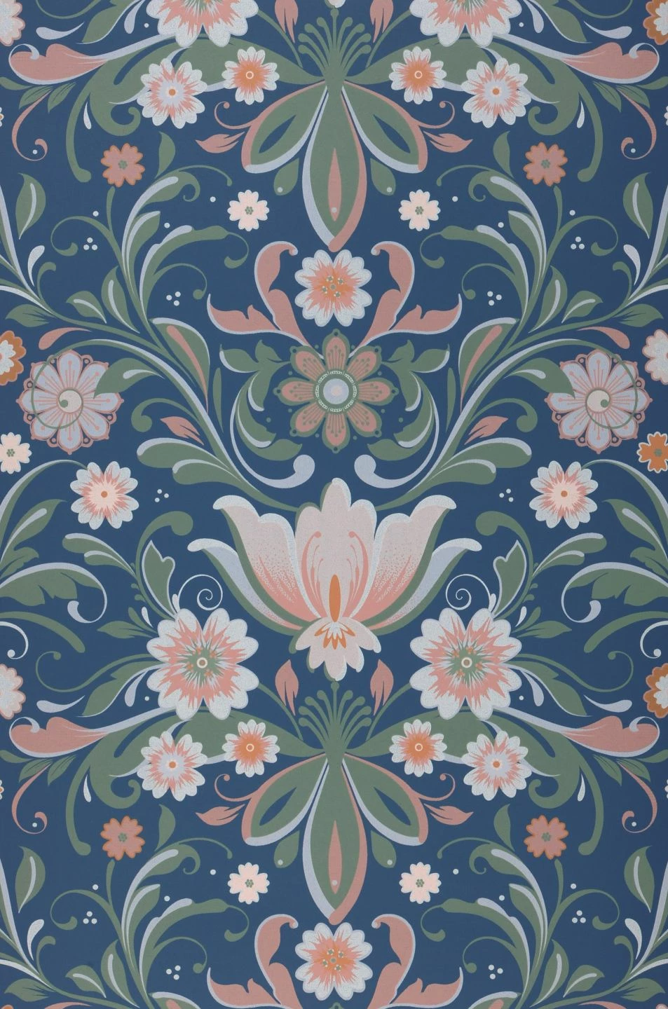 Ein klassisches Muster aus kunstvoll gemalten Blüten und Blattranken, die den azurblauen Grund der Tapete fast ganz ausfüllen, schmückt jeden Raum mit seiner zeitlosen Eleganz. Das florale Design kommt mit wenigen hellen Rosa- und Orangetönen, Zartblau und Resedagrün aus, die die Blüten und Blätter zu einem harmonischen Gesamteindruck werden lassen. Bis ins kleinste Detail ausgearbeitet sind die zarten Muster der Blumen.