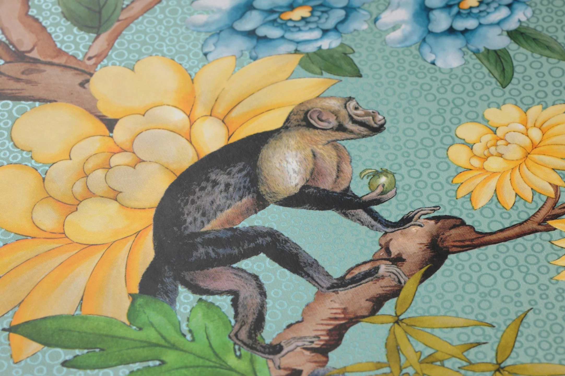 Eine Blumentapete voll von üppigem Leben zieht mit Savana bei Ihnen ein. Ungeheuer dynamisch erscheinen die Blüten in hellen Farben mit ihren verschiedenen Größen, so als wären sie innerhalb weniger Sekunden aus den Zweigen gewachsen. Die Affen auf den Blütenzweigen wirken geradezu klein gegen die ausladenden Blumen. Eine turbulente, farbenfrohe Kulisse für einen Raum, der Ihnen Kraft und Energie spendet.
