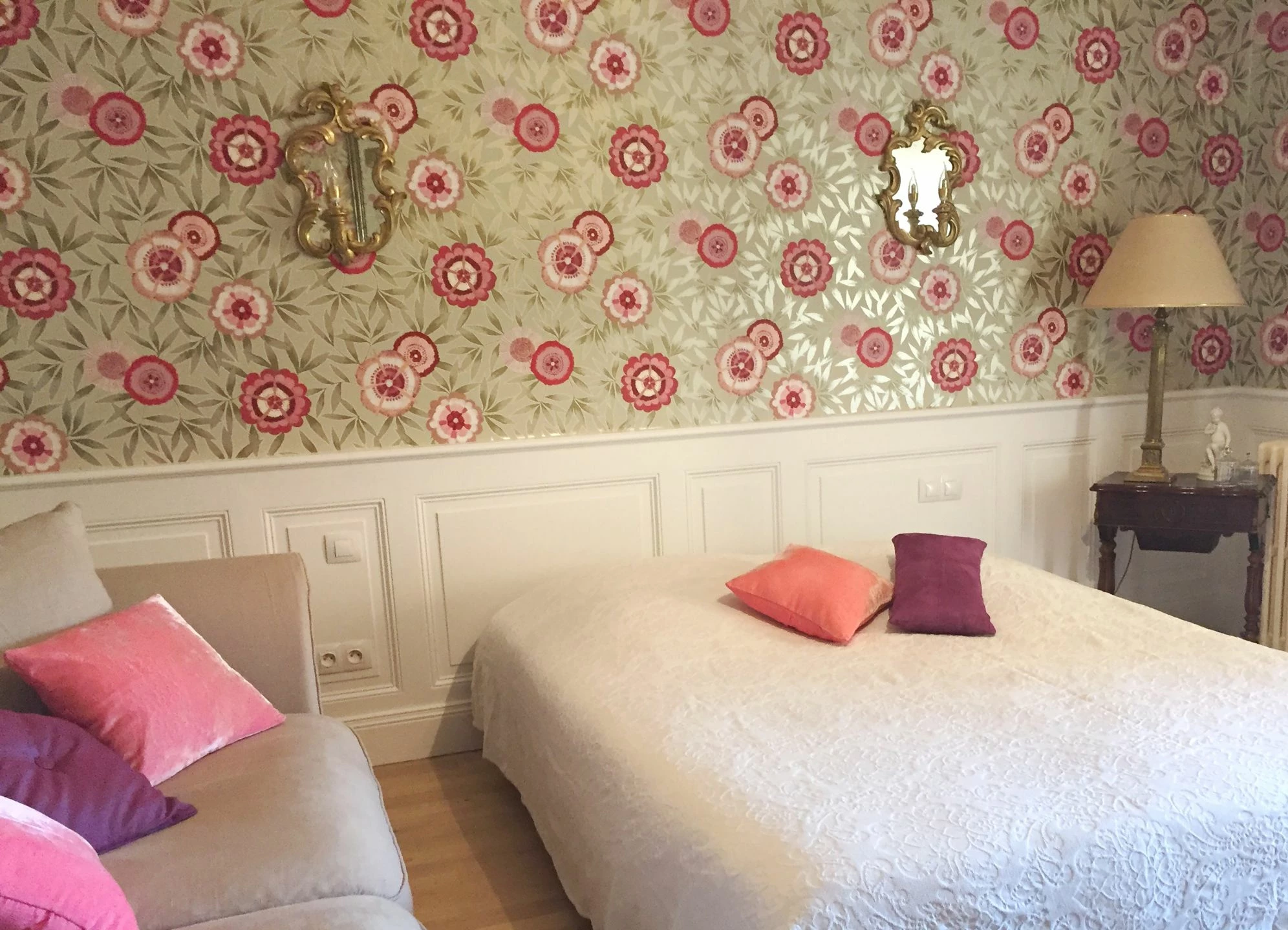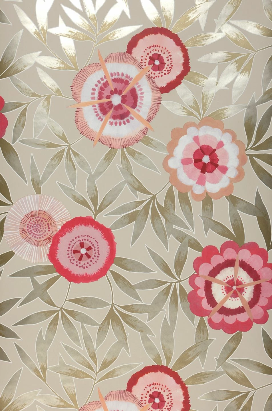 Besonders kunstvoll und wie handgemalt wirken die stilisierten Blüten in Rosa- und Rottönen. Perlgoldene Highlights zieren die schlanken Blätter, deren Oliv- und Beigetöne harmonisch zum cremefarbenen Untergrund passen, so dass die Blüten noch mehr Leuchtkraft entfalten. „Sefina“ bringt farbenfrohe Tupfer an Ihre Wände und passt ausgezeichnet zu hellen Möbeln und romantischen oder skandinavischen Einrichtungselementen.