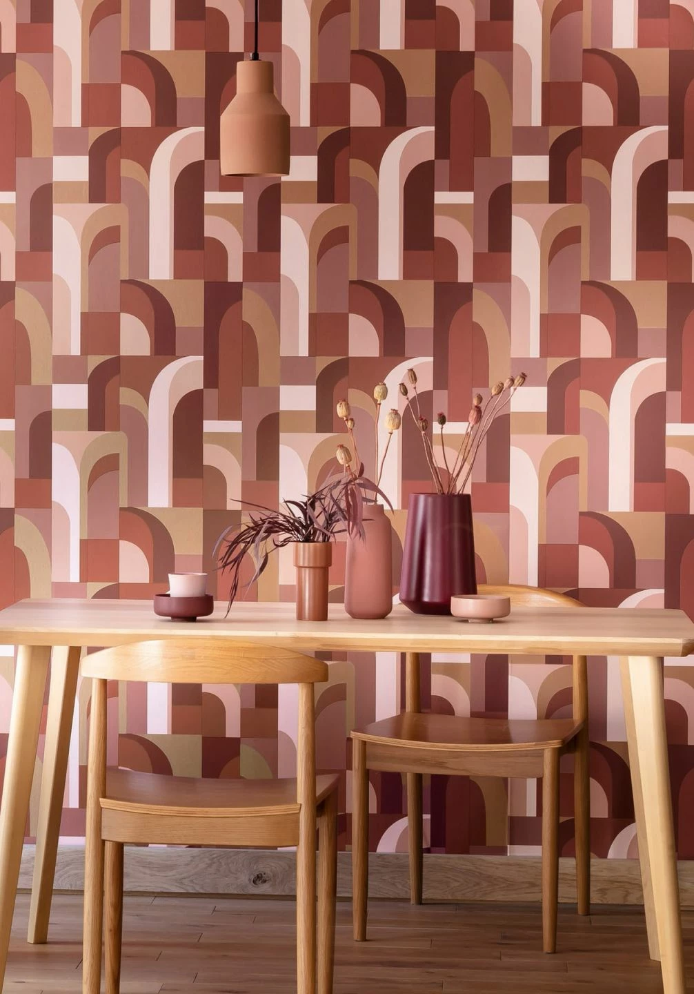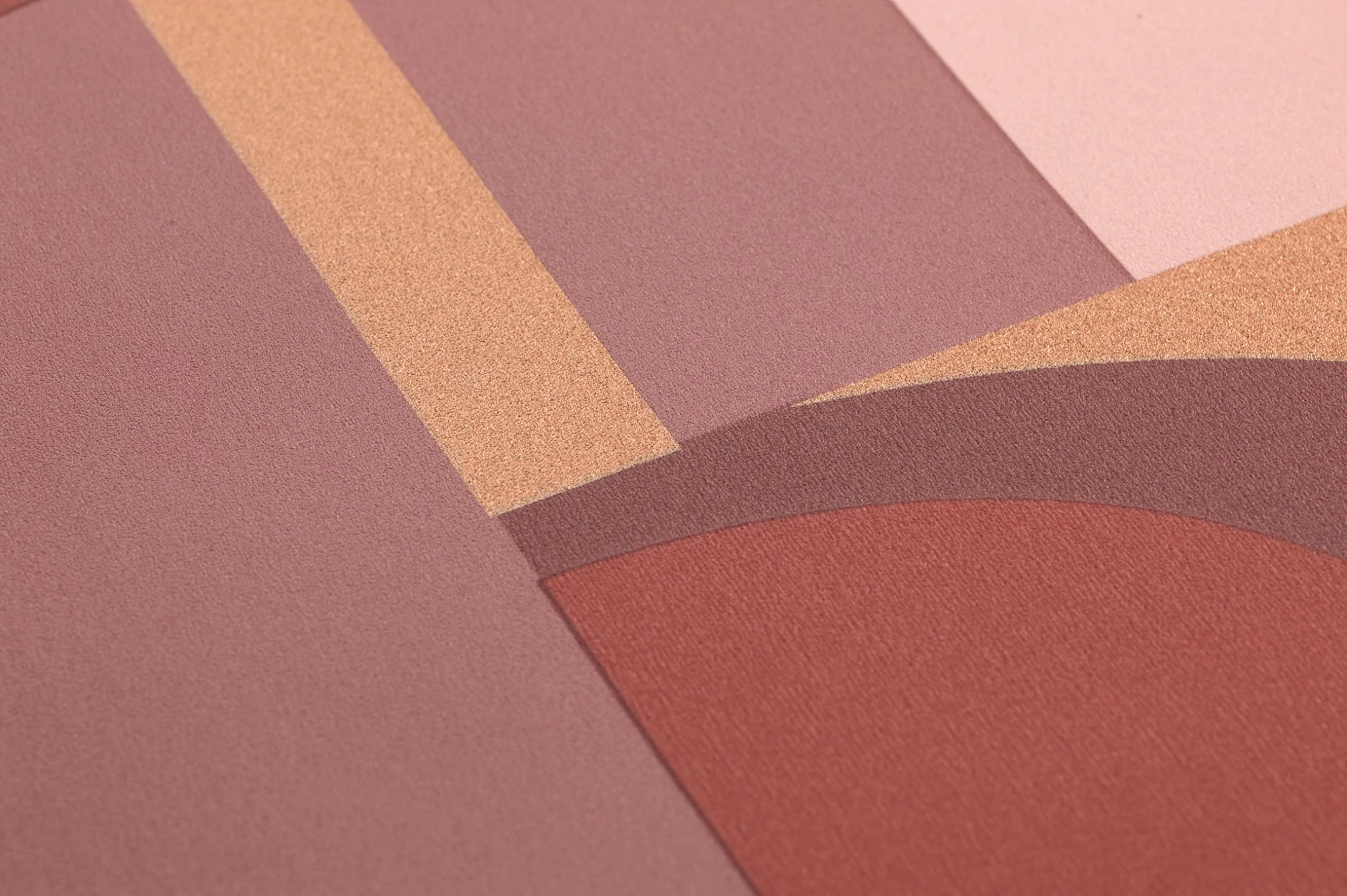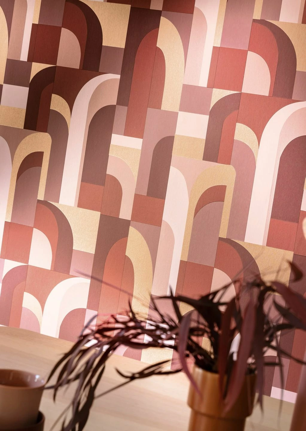 Warme Braun- und Rosatöne bestimmen den Charakter dieser Art-Deco-Tapete. Die Farben bilden flächige Bögen im Stil des Art Deco. Dazwischen sorgt Perlgold für harmonische Lichtreflexe. Die warme Farbgebung lässt sich mit dunklem oder hellem Holz kombinieren. Aufgrund der unempfindlichen Oberfläche aus Vinyl schmückt die Tapete ein Badezimmer ebenso wie eine wohnliche Küche oder ein gemütliches Kaminzimmer.