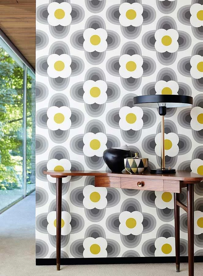 Flächige stilisierte Blumen sind das Markenzeichen der irischen Designerin Orla Kiely. Im Retro-Stil symmetrisch angeordnet, strahlen sie Klarheit und Ruhe aus. Die gelbgrünen Zentren der Blüten, umrahmt von Blättern in abgestuften Grautönen, ziehen den Blick magisch an. Die glatte Vliestapete verleiht Ihrem Raum Helligkeit und Freundlichkeit – mit einem individuellen Touch! „Selene“ erhalten Sie in drei weiteren Farbkombinationen.