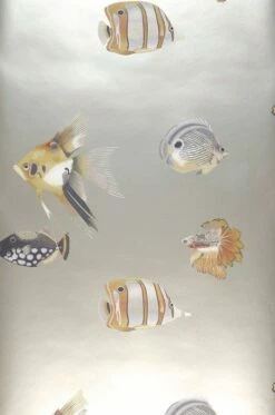 Tauchen Sie ab und ein. Die beruhigende Magie von zauberhaft gemusterten Fischen im silbernen Traumsee bietet sich für extravagante moderne Bad-Gestaltung an. Die scheinbare Synchronität wird durch einige Fische, die in entgegengesetzter Richtung schwimmen, unterbrochen. Lichteinfall erzeugt eine wohltuende Bewegung.
