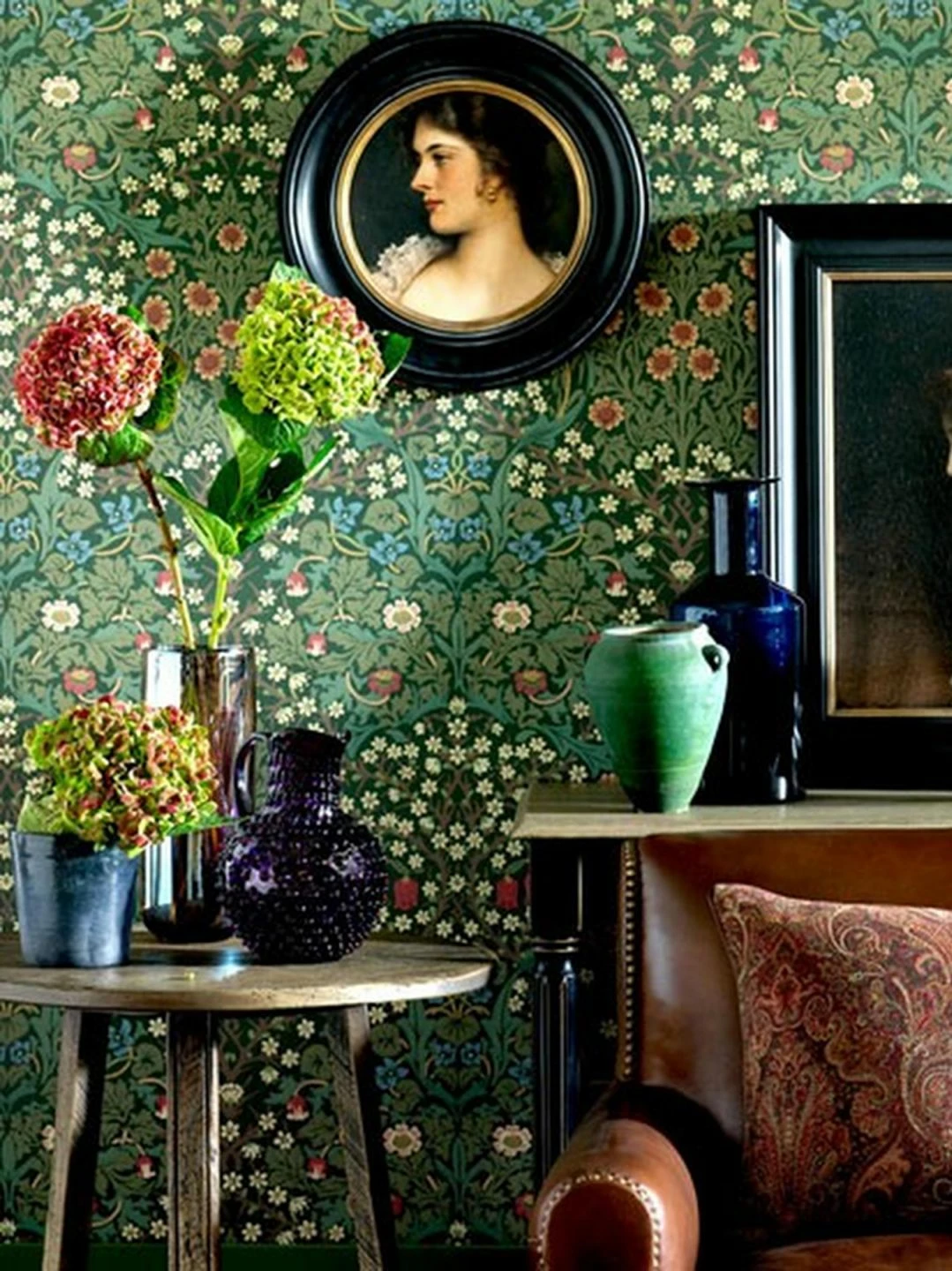 Über und über mit blühenden Blumen bedeckt ist die englische Papiertapete von der traditionsreichen Marke Morris & Co. Bunte Blütenfarben und Blätter in verschiedenen Grüntönen auf schwarzgrünem Grund schaffen eine Fülle des Lebens, die durch die fast unmerklich symmetrische Anordnung zu einer zugrundeliegenden Ordnung findet. Das verwendete Leimdruckverfahren gibt dem Blumenmuster die Anmutung von Handwerkskunst und Zeitlosigkeit.