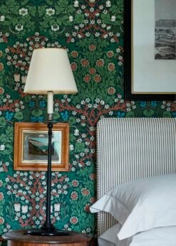 In der Vielfalt der Blüten und Blattranken kommt eine verborgene Symmetrie zum Vorschein, die der scheinbaren Willkürlichkeit der Anordnung eine Ordnung verleiht. Das Rot, Pastellblau und immer wieder auftauchendes Hellgelb bilden eine Einheit mit den verschiedenen Grüntönen der Blätter und dem schwarzgrünen Grund. Das Leimdruckverfahren steuert einen handgearbeiteten Eindruck bei, der bestens mit einer Einrichtung im Retro-Stil harmoniert.