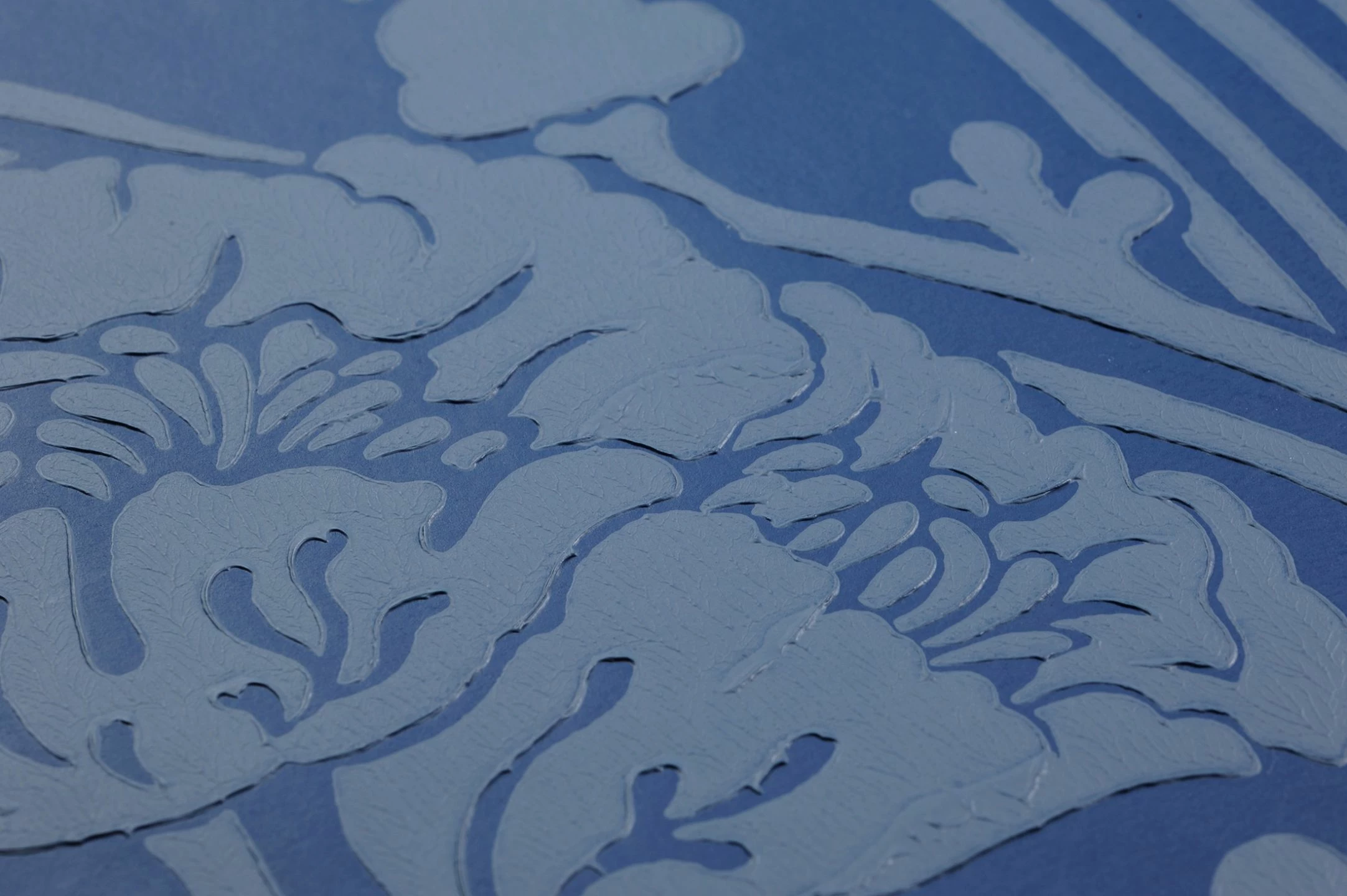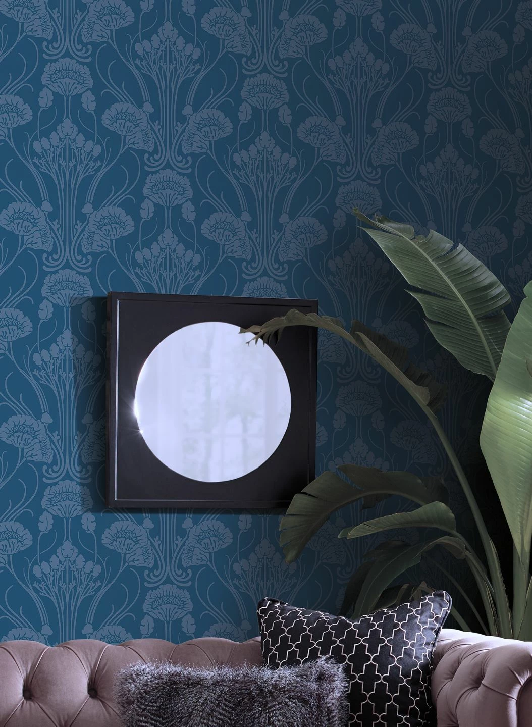 Der angenehm geringe Kontrast zwischen dem Dunkelblau des Hintergrunds und dem blaugrauen Muster macht die besondere Atmosphäre aus, die von dieser Vliestapete ausgeht. Aus den ruhigen Blautönen schöpft das klassische Jugendstil-Muster aus stilisierten Blüten, Blättern und ineinander verschlungenen Stängeln seine Ausdrucksstärke. Durch den besonders satten Farbauftrag des Leimdrucks bildet das Muster eine fühlbar erhabene Struktur auf dem matten Untergrund.