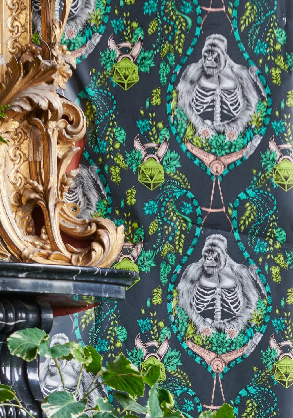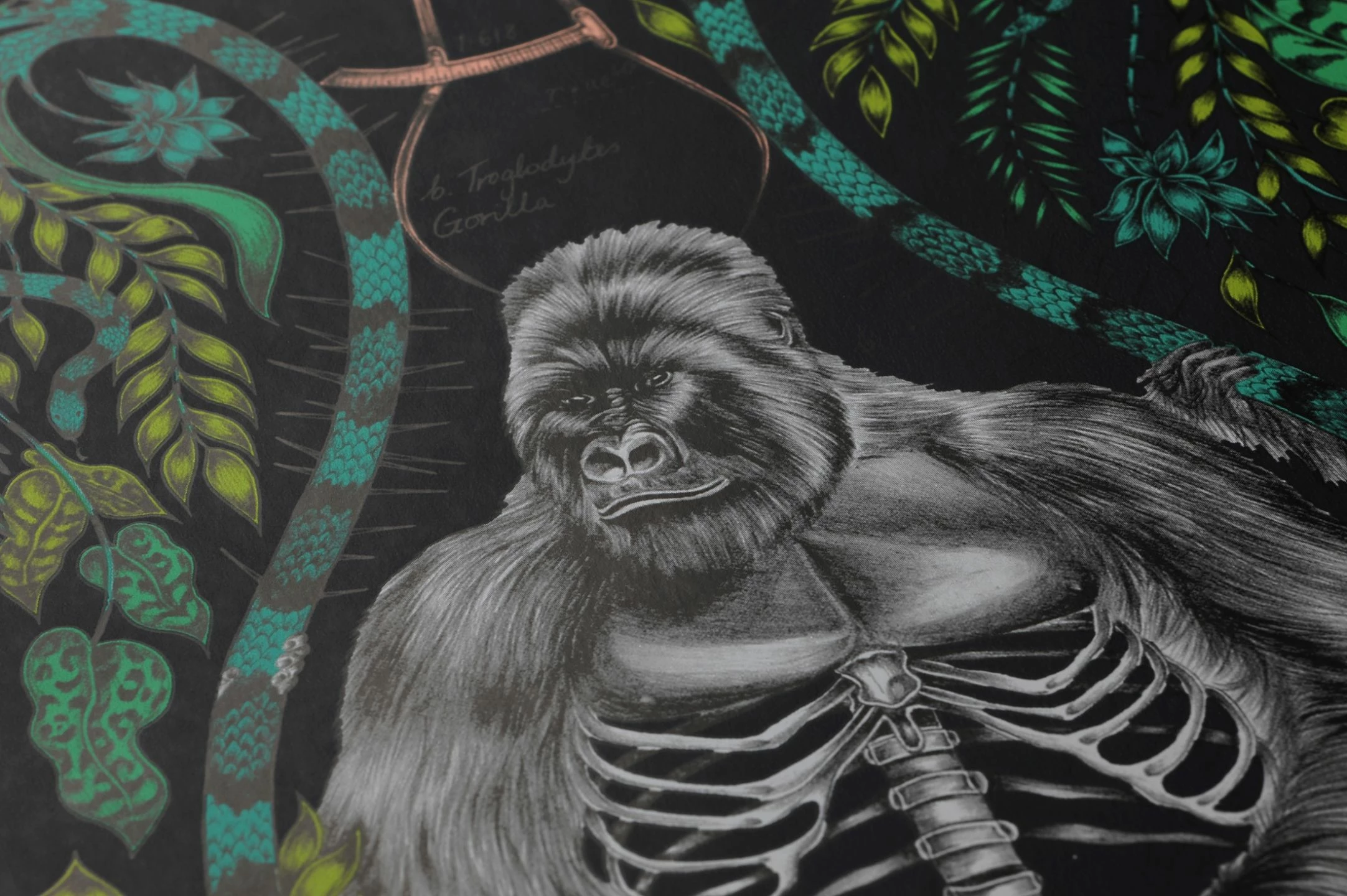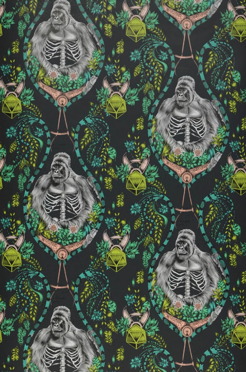 Stilisierte Blattranken, naturwissenschaftliche Instrumente und anatomisch präzise gezeichnete Gorillas – eine ungewöhnliche Zusammenstellung von Motiven findet sich auf der Vliestapete. Grüntöne dominieren auf dem schwarzgrauen Grund, während die Gorillas schwarzweiß wie Bleistiftzeichnungen gehalten und wie in einem zoologischen Lehrbuch beschriftet sind. „Silverback“ ist eine Tapete für Individualisten mit einem Faible für die Zoologie, die Ihren Raum unverwechselbar macht. (Menagerie)