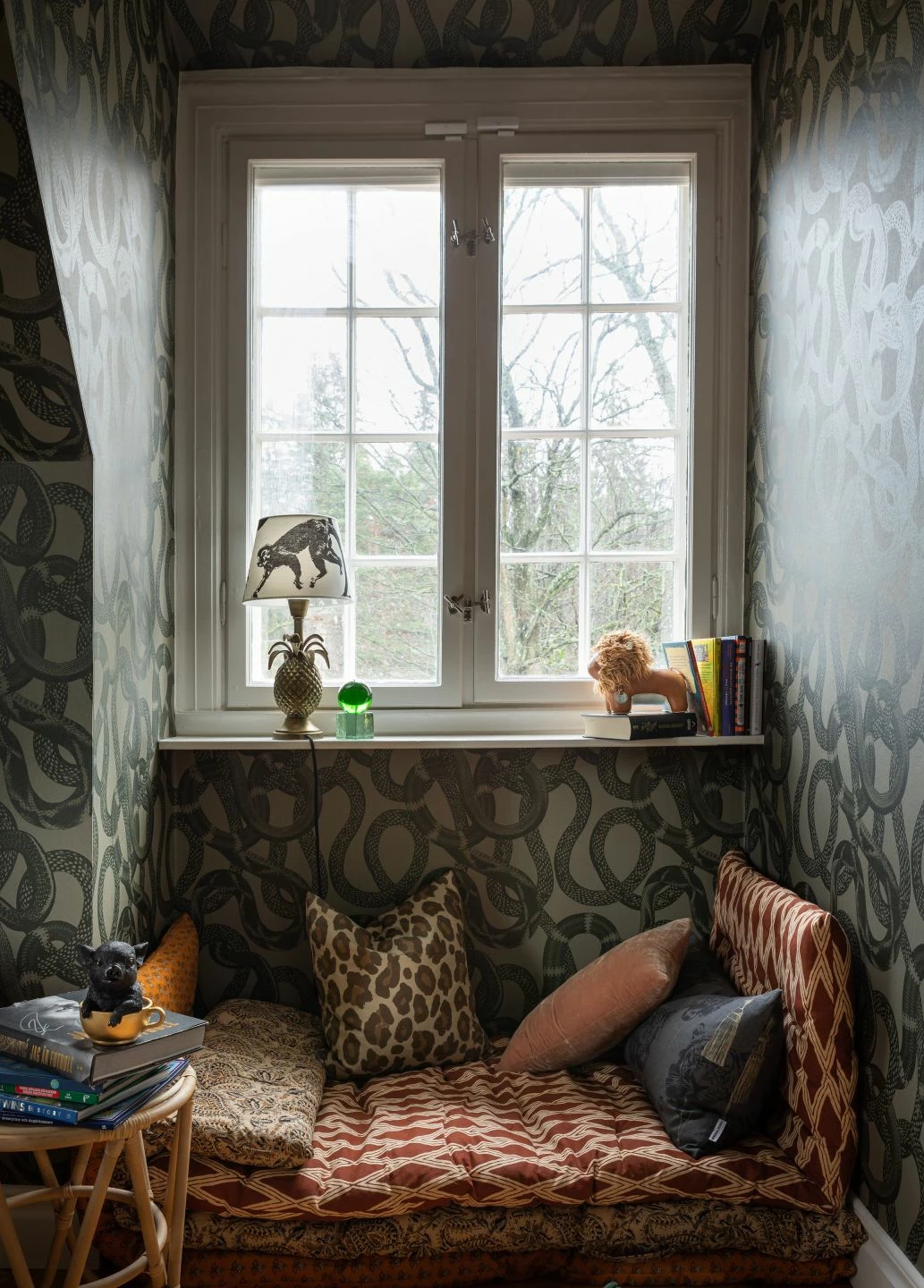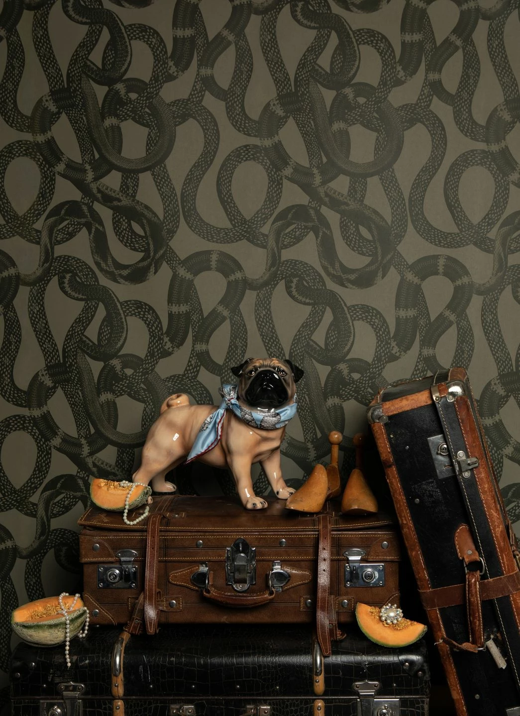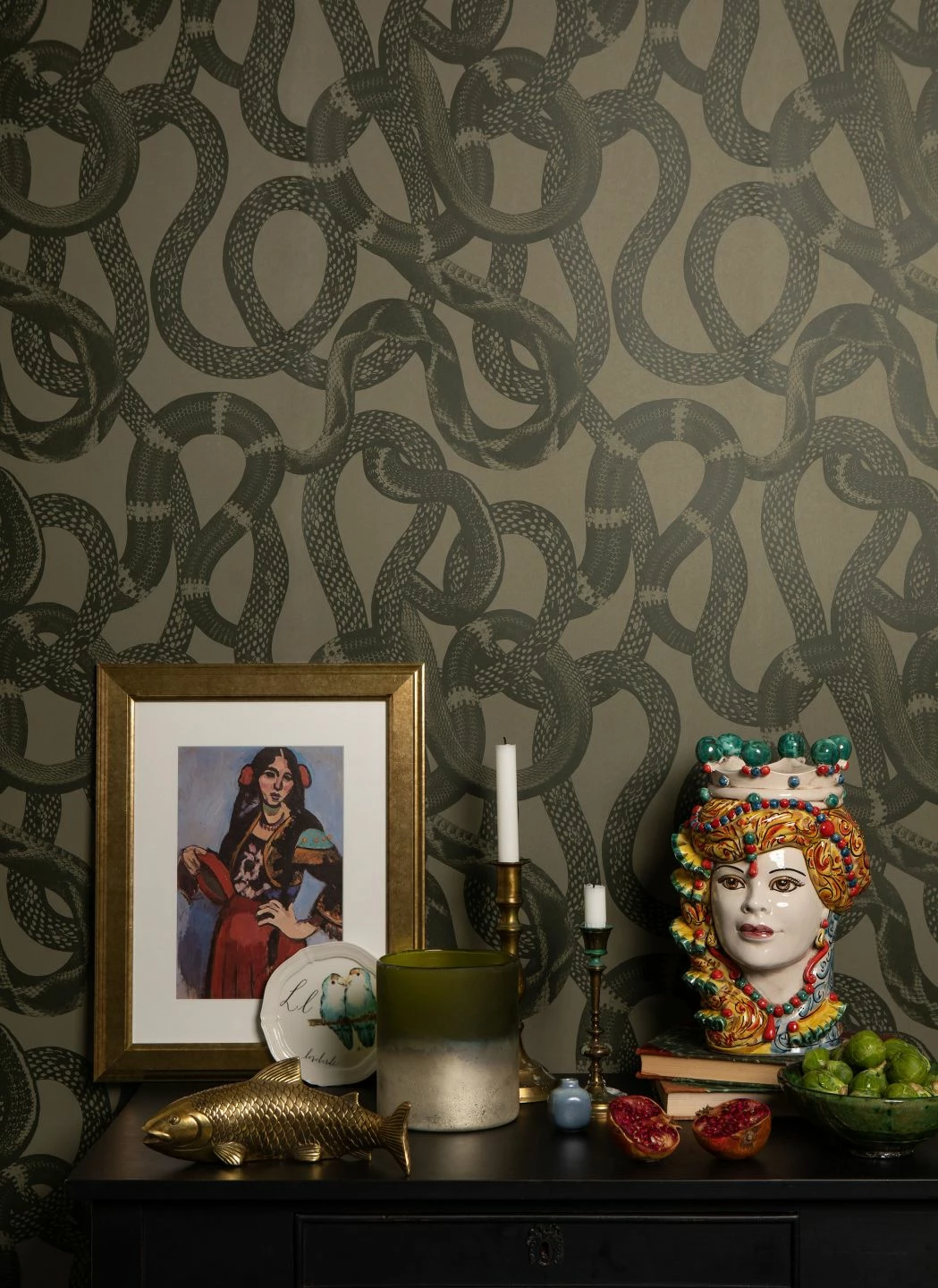 Schlangen in ihrer ganzen Faszination sind das Thema dieser Vliestapete der schwedischen Designerin Lisa Bengtsson. Die vielleicht am meisten verkannten Tiere schlängeln sich auf und ab an Ihren Wänden. Beinahe getarnt durch die schwarzen Illustrationen auf dem moosgrauen Grund, kommen dennoch die schuppige Struktur ihrer Haut und die unterschiedliche Zeichnung der Reptilien zum Ausdruck. Die ausgefallene Tapete verträgt Ton-in-Ton-Deko ebenso gut wie farbliche Elemente als Gegenpol.