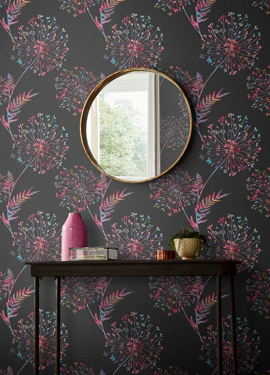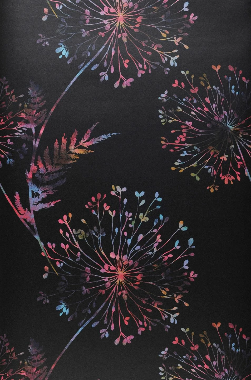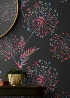 Kennen Sie den Blütenrausch? Auf schwarzmattem Grund eröffnen die bauschigen Blütenstände mit kleinen Farnblättern ein spektakuläres Multicolor-Ereignis. Es erinnert an beschwingte Bohème-Zeiten und kleidet das Boudoir der Dame raffiniert aus. Extravagante Schminkplätze und Ankleidezimmer erhalten durch diese einfach zu verarbeitende Vliestapete die Leichtigkeit des Seins.