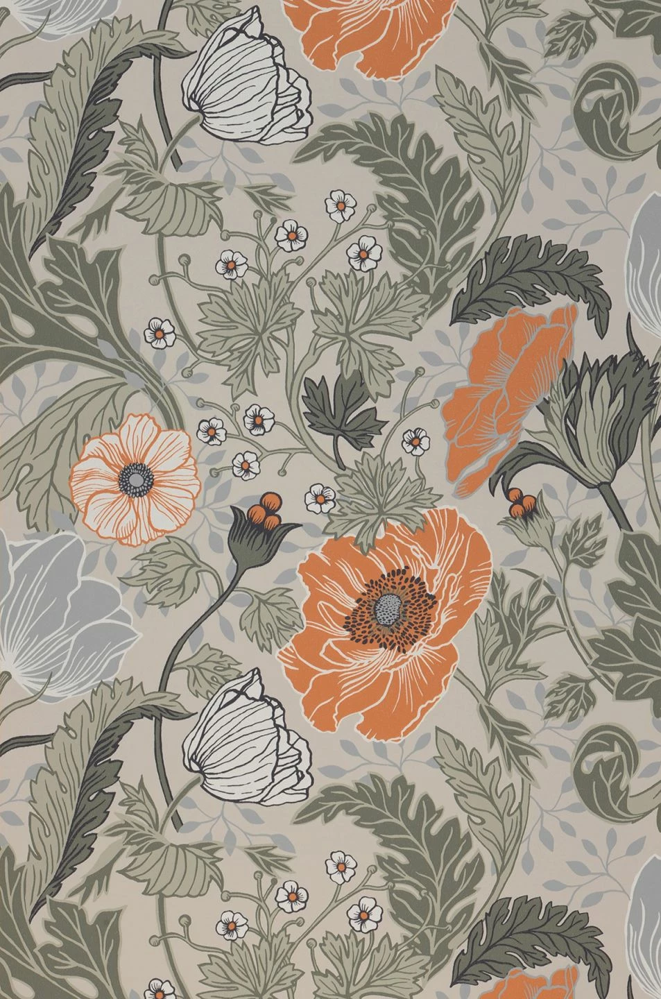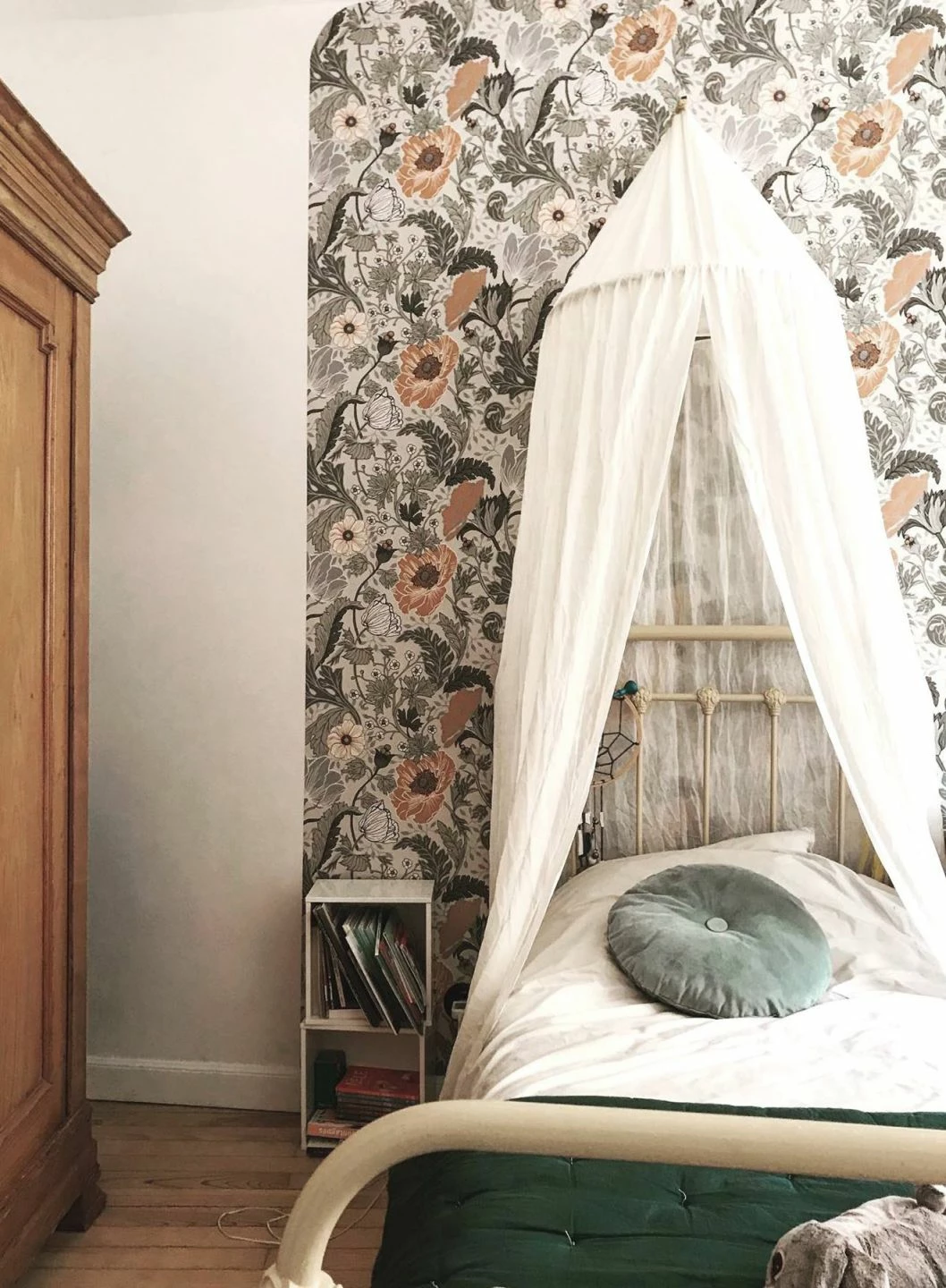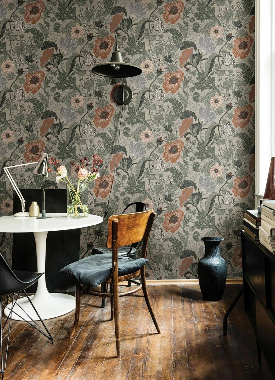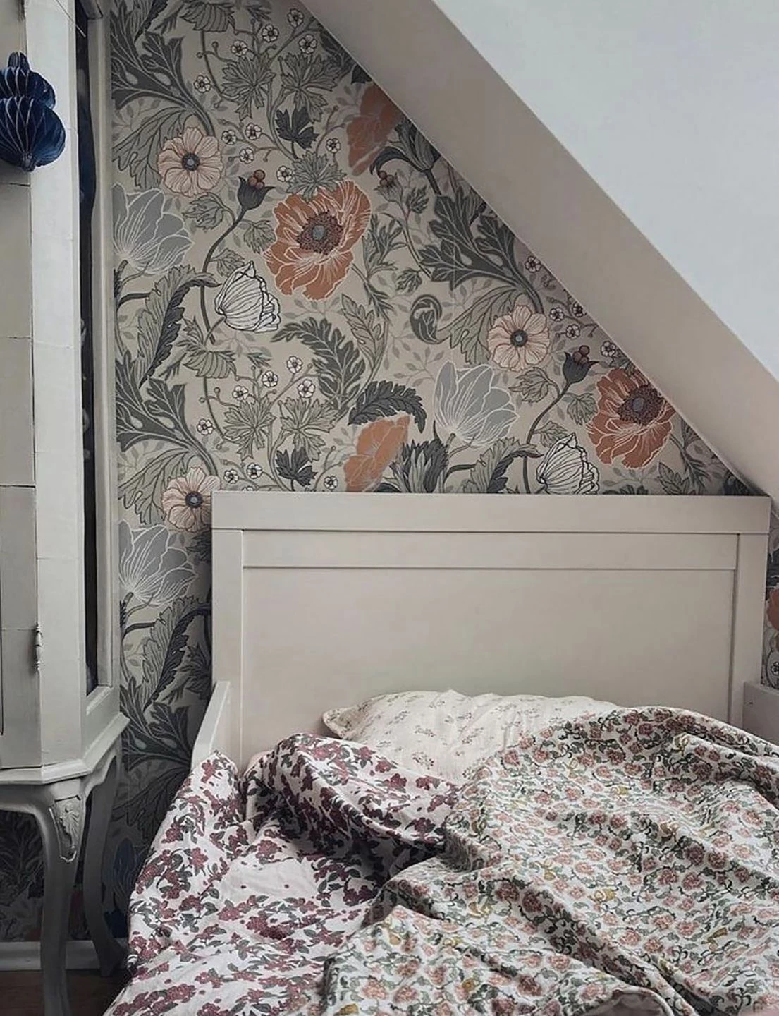 Auf grauweißem Fond entwickeln sich die Blumenranken und Blütenköpfe in Grautönen, Oliv und Orange zu einer fröhlichen Wandinszenierung, die mitreißt und für endlos gute Laune sorgt. Weiße Möbel, echte Grünpflanzen und romantische Landhaus-Accessoires ergänzen das harmonische Bild.