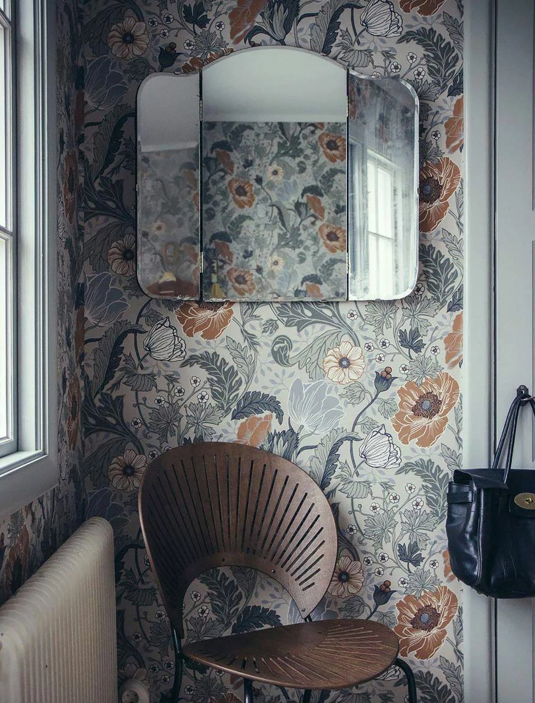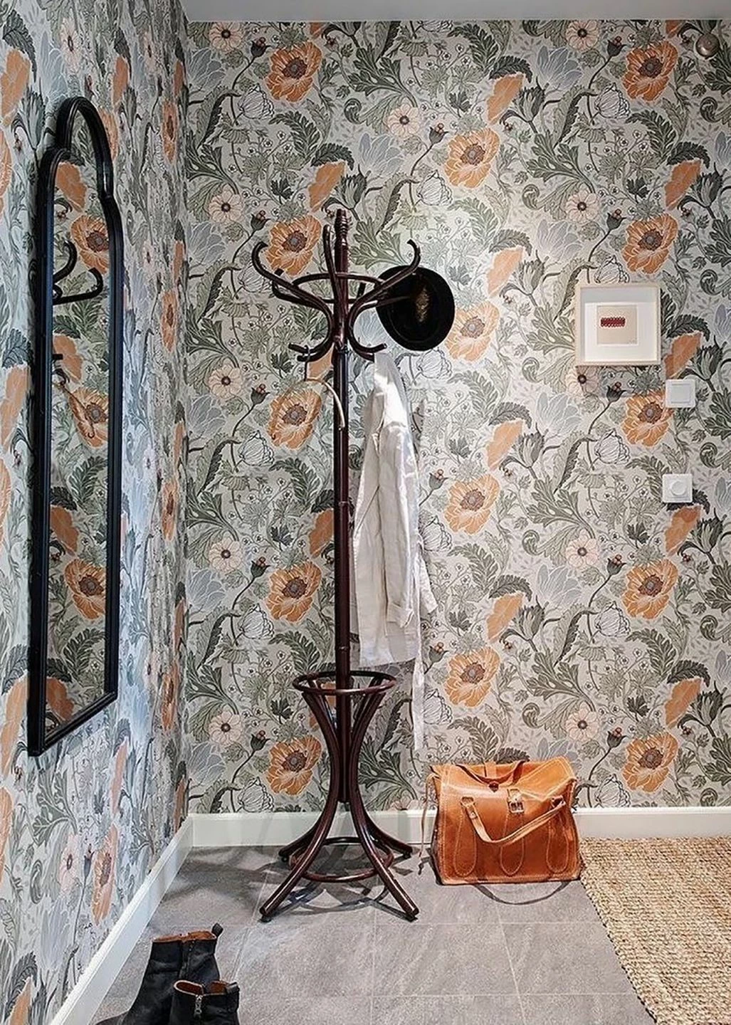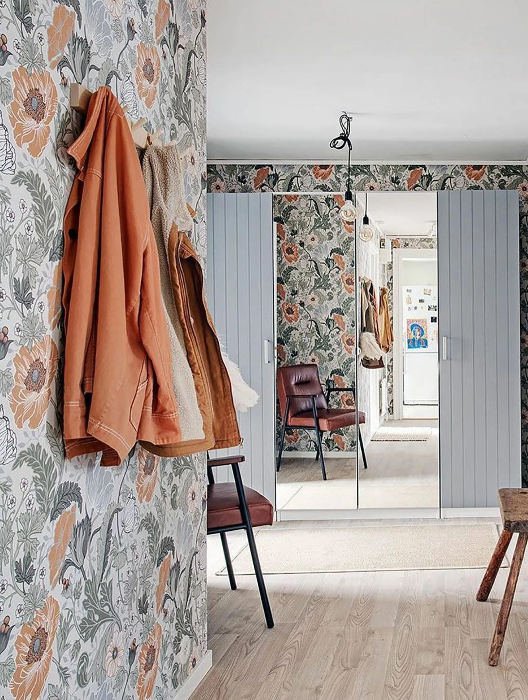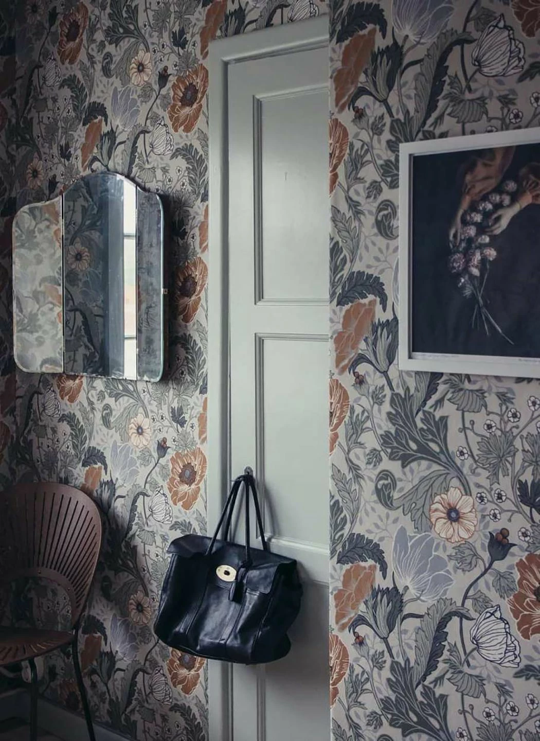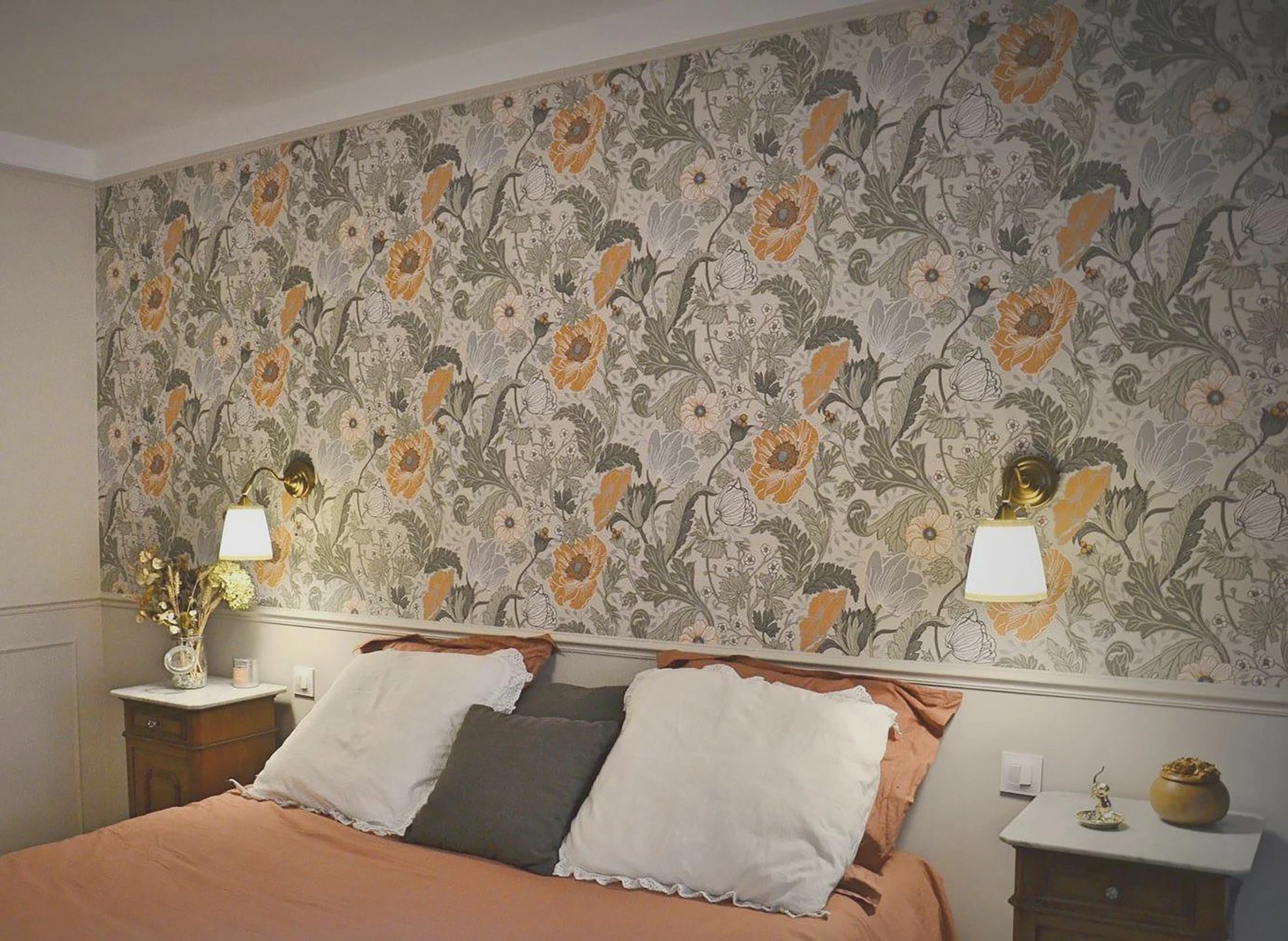Auf grauweißem Fond entwickeln sich die Blumenranken und Blütenköpfe in Grautönen, Oliv und Orange zu einer fröhlichen Wandinszenierung, die mitreißt und für endlos gute Laune sorgt. Weiße Möbel, echte Grünpflanzen und romantische Landhaus-Accessoires ergänzen das harmonische Bild.