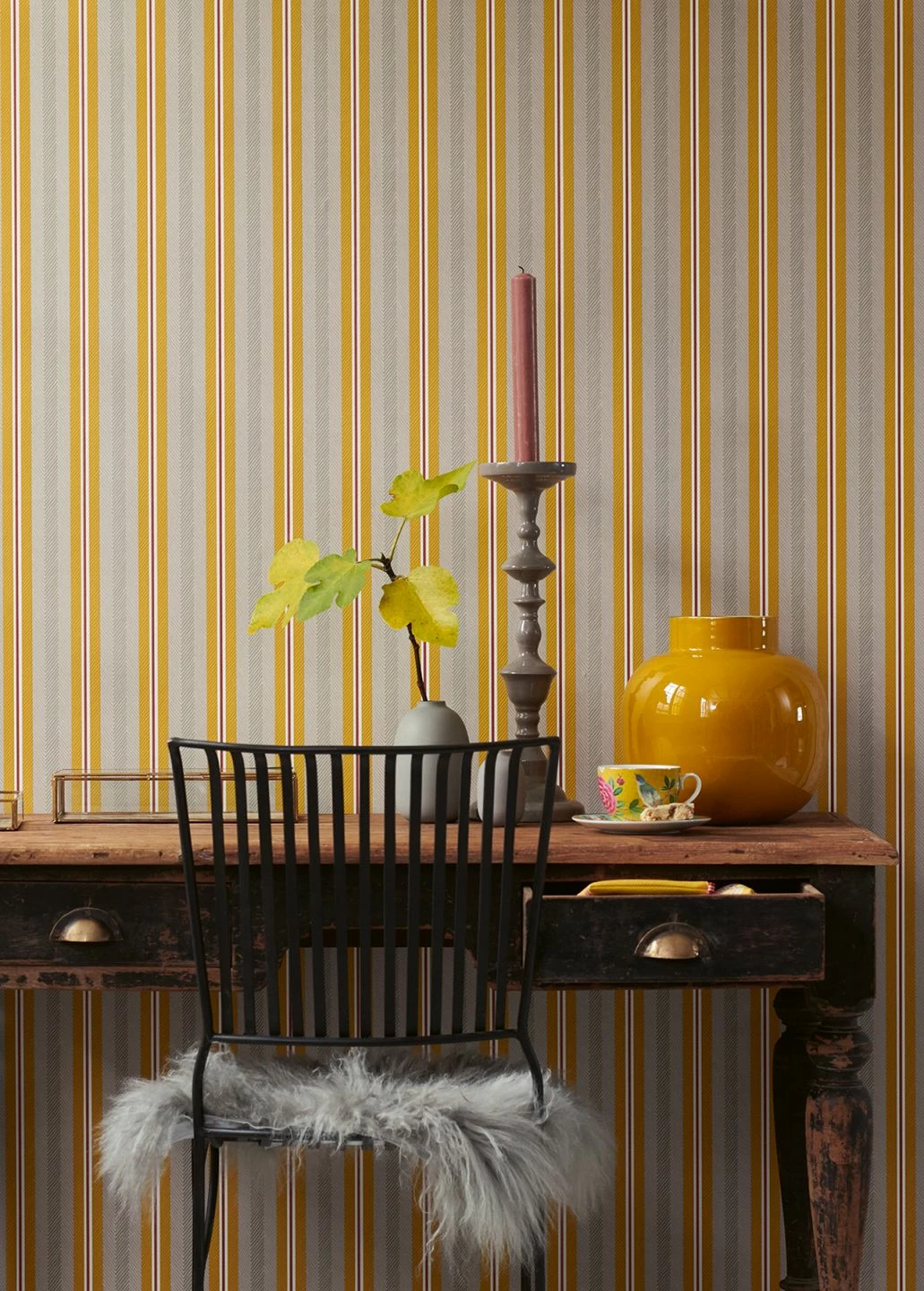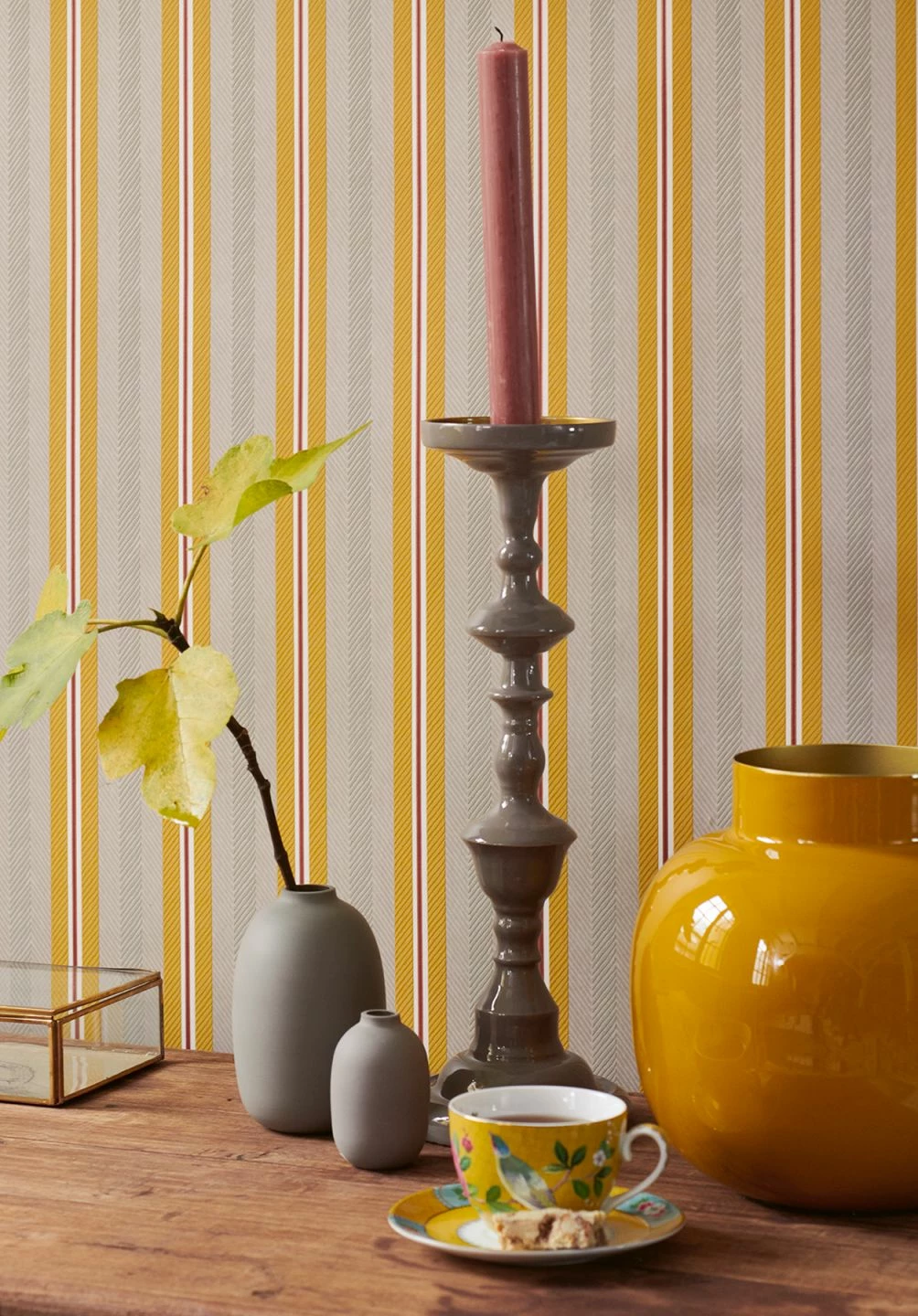 Warme Töne wie Honiggelb, Rot und schimmerndes Kupfer in klassischen Streifen geben dieser Vliestapete ihre besondere Ausstrahlung. Das Fischgrätmuster mit leicht erhabener Oberflächenstruktur innerhalb der Streifen spielt mit den Konturen des Raums, während der senkrechte Verlauf der Streifen die Höhe Ihrer Zimmerdecke betont. Die Tapete verleiht Ihrem Raum zeitlose Eleganz.